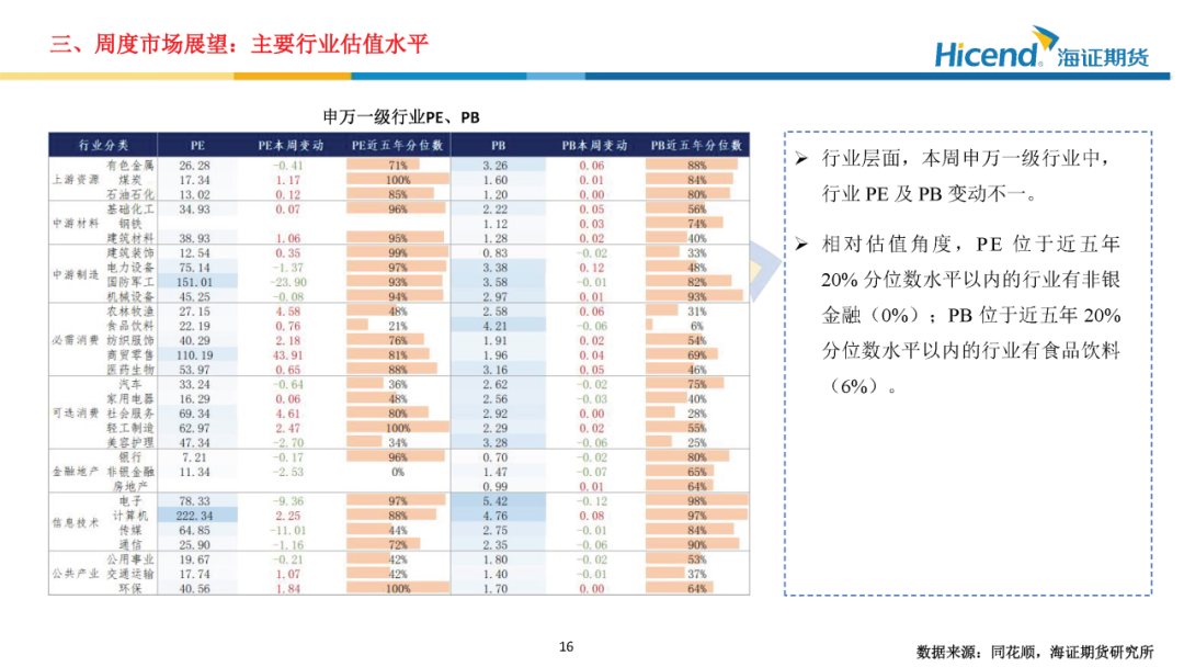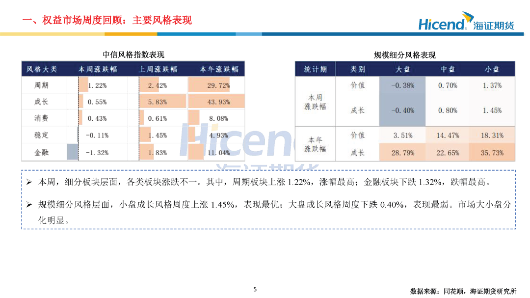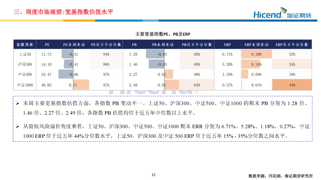 本周,A股放量冲高回落,全市场日均成交额为2.33万亿元,较上周增加5280亿元,市场成交活跃度大幅上升。股指期货端,期指合约的整体日均成交量较上周小幅上行,期指端的交投情绪回温。在剔除预期分红后,期指合约持仓量加权年化基差率方面,各期指合约基差变动不一,IH、IF、IC、IM期末持仓量加权年化基差率(分红调整)分别为1.14%、-1.22%、-8.95%、-13.43%,分别较上周变动0.30%、2.01%、-0.31%、-3.03%。估值角度,各指数PB变动不一。上证50、沪深300、中证500、中证1000的期末PB分别为1.28倍、1.46倍、2.27倍、2.49倍,各指数PB估值均位于近五年中位数以上水平。流动性及资金面,截至本周四,10年期国债到期收益率期末值为1.81%,较上周末下行4BP;1年期国债到期收益率期末值为1.38%,较上周末下行9BP。国债长短期利差较上周末上行6BP。市场流动性环境相对宽松。融资数据方面,截至本周四,融资余额为2.5万亿元,周一到周四融资净买入额为414亿,资金参与情绪向好。