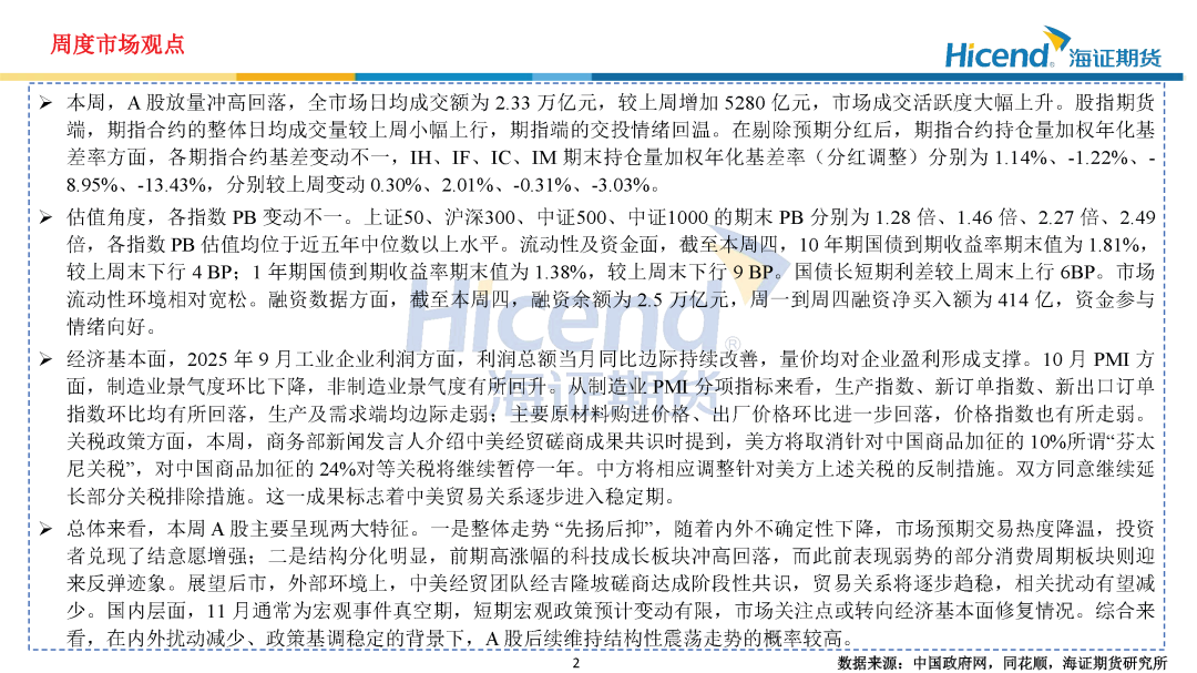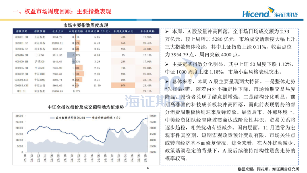 总体来看,本周A股主要呈现两大特征。一是整体走势“先扬后抑”,随着内外不确定性下降,市场预期交易热度降温,投资者兑现了结意愿增强;二是结构分化明显,前期高涨幅的科技成长板块冲高回落,而此前表现弱势的部分消费周期板块则迎来反弹迹象。展望后市,外部环境上,中美经贸团队经吉隆坡磋商达成阶段性共识,贸易关系将逐步趋稳,相关扰动有望减少。国内层面,11月通常为宏观事件真空期,短期宏观政策预计变动有限,市场关注点或转向经济基本面修复情况。综合来看,在内外扰动减少、政策基调稳定的背景下,A股后续维持结构性震荡走势的概率较高。