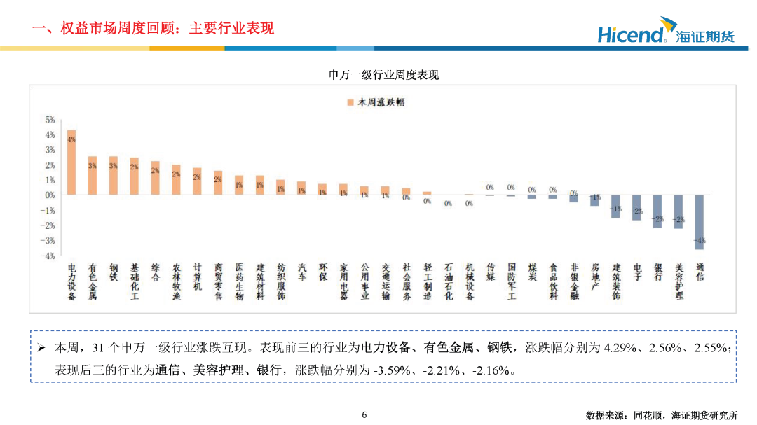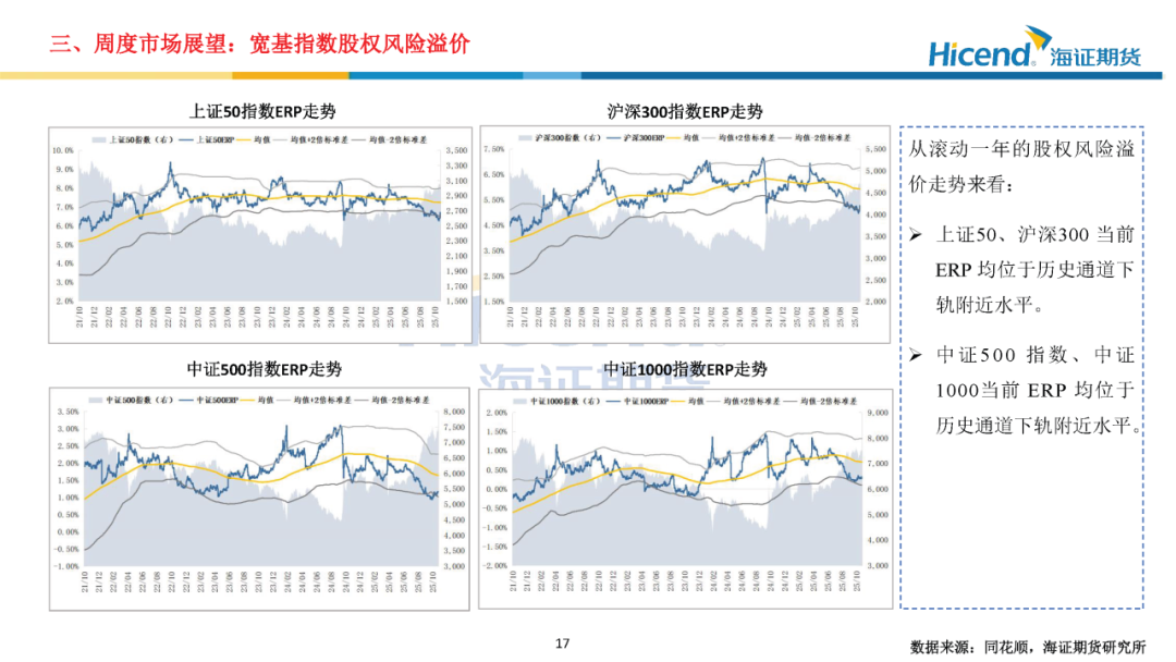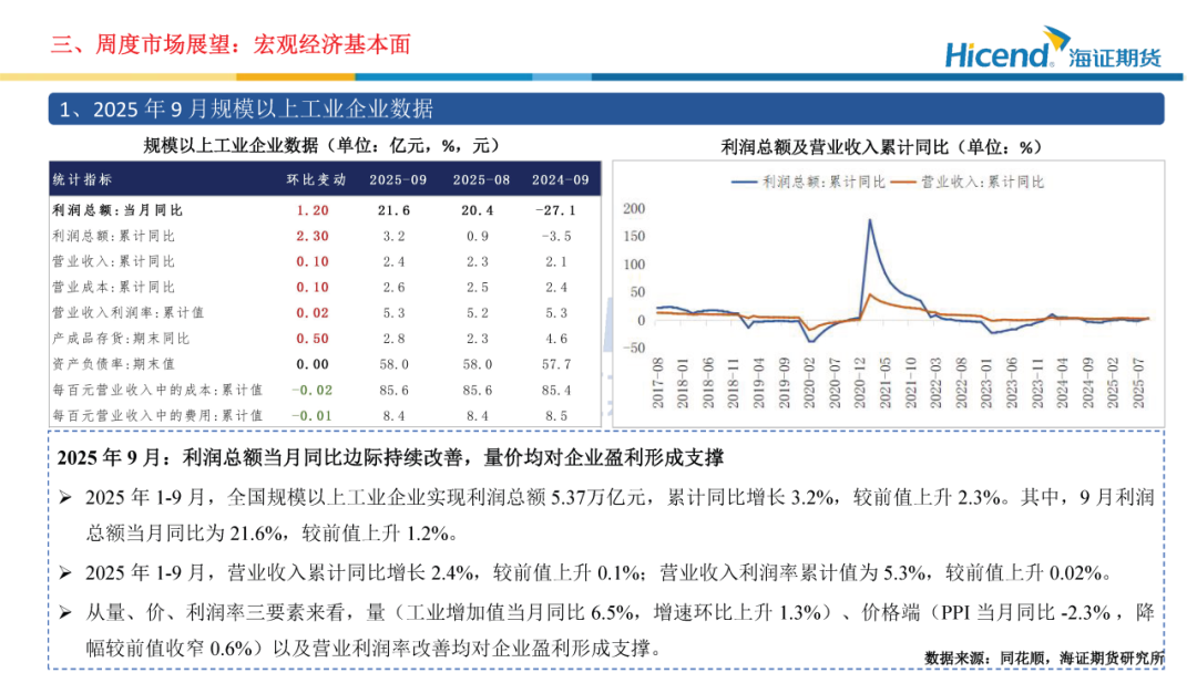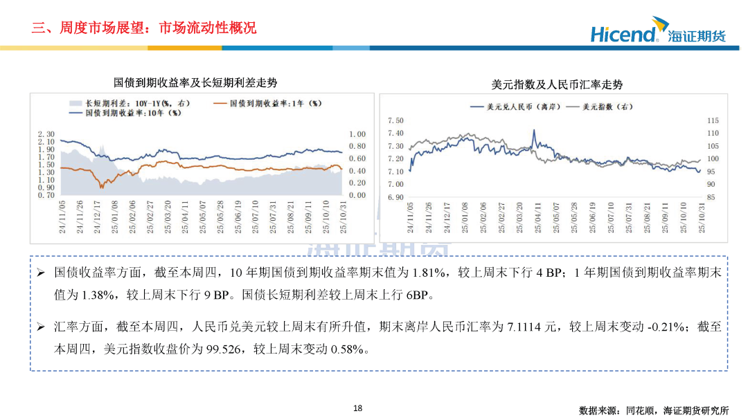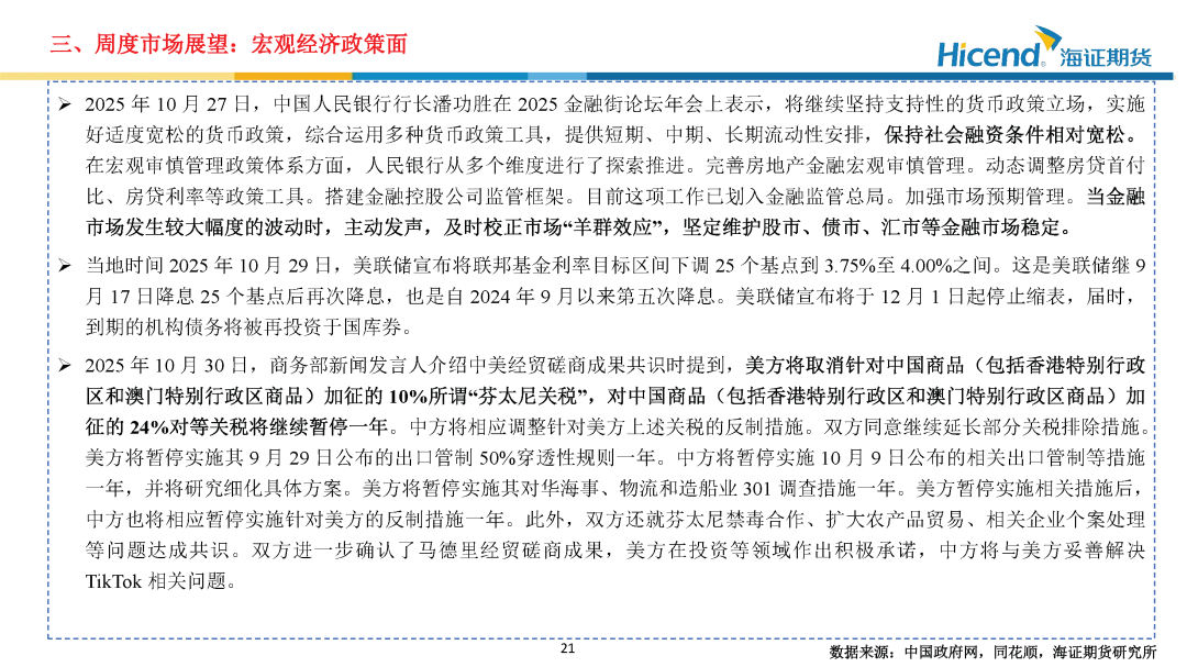 经济基本面,2025年9月工业企业利润方面,利润总额当月同比边际持续改善,量价均对企业盈利形成支撑。10月PMI方面,制造业景气度环比下降,非制造业景气度有所回升。从制造业PMI分项指标来看,生产指数、新订单指数、新出口订单指数环比均有所回落,生产及需求端均边际走弱;主要原材料购进价格、出厂价格环比进一步回落,价格指数也有所走弱。关税政策方面,本周,商务部新闻发言人介绍中美经贸磋商成果共识时提到,美方将取消针对中国商品加征的10%所谓“芬太尼关税”,对中国商品加征的24%对等关税将继续暂停一年。中方将相应调整针对美方上述关税的反制措施。双方同意继续延长部分关税排除措施。这一成果标志着中美贸易关系逐步进入稳定期。