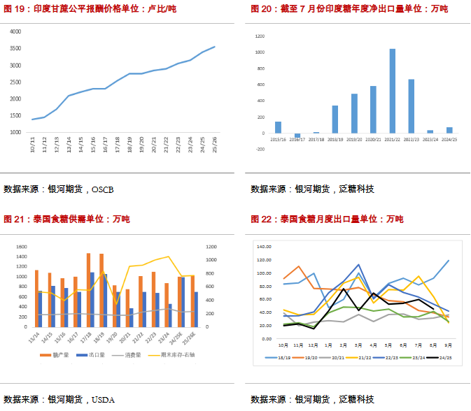 泰国24/25榨季累计产糖1004万吨,同比增加14%左右。本榨季截至8月泰国累计出口糖497.19万吨,同比增加104.17万吨,增幅达26.5%,但是和之前年份相比,累计出口量仍处于偏低位置。而进入3季度泰国糖的出口将面临品质下降及与巴西糖出口竞争等考验,有一定的销售压力。新榨季,泰国天气较为适宜,降雨理想,预计新榨季泰国糖产量也将维持在高位。市场预计新榨季泰国糖产将达1100万吨。