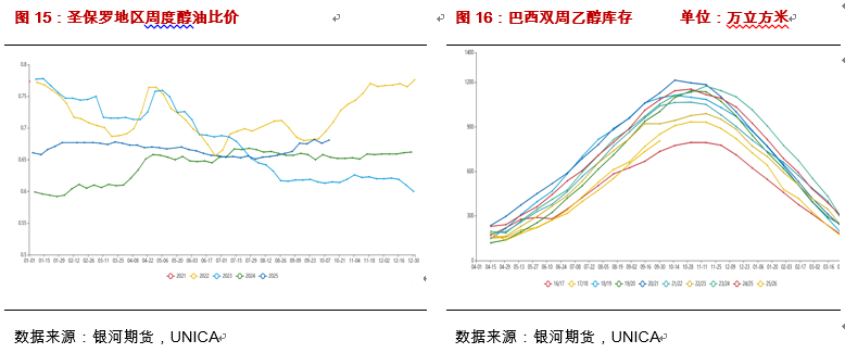 巴西25/26榨季糖产预期较高,市场预计25/26年底巴西糖产在4400-4500万吨,这一产量虽然和去年比相差不大,但是也是位于近些年历年同期的高位。近期巴西主产区原糖的生产迎来了本榨季的关键转折点,即累计产糖量首次实现同比增长。此外随着时间推移,巴西甘蔗加工重心逐渐转向生产乙醇,巴西制糖比开始出现季节性下降的趋势。目前乙醇折糖价在15.73美分/磅,处于历年同期偏高位,糖醇价差也缩小至1美分以下,有时甚至为负,预计后期转头生产乙醇的企业比例大概率将有所增加。然而由于巴西玉米乙醇成本更低,性价比更高,因此即使更多甘蔗季节性转向生产乙醇,但是制乙醇比例可能增加的幅度不及之前年份,这也导致未来巴西甘蔗糖产量可能仍将处于历年同期的偏高位。