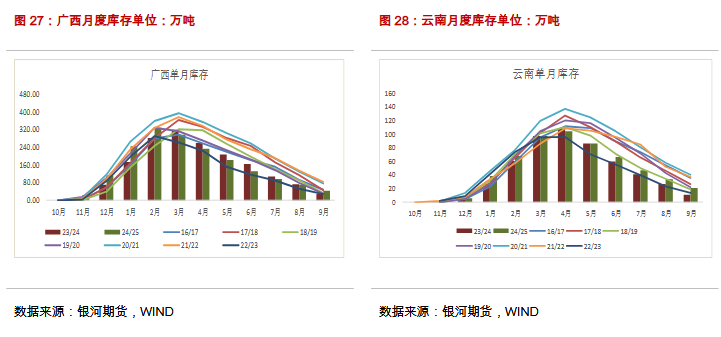 根据泛糖科技数据,第三方库存方面,截至9月广西食糖第三方仓库库存数量约46.76万吨,环比减少了30.07万吨,较去年同期增加约19.69万吨,处于近5年的中位。根据糖业协会数据,工业库存方面,9月份广西月度食糖库存量为44.21万吨,较8月环比下降约26.68万吨,同期云南月度食糖库存量为20.47万吨,较8月环比下降13.17万吨。产销率方面,截至9月份,广西糖月度累计产销率为93.16%,较去年低了2.45个百分点,处于近些年历年同期的中位,云南糖月度累计产销率为91.54%,较去年低了2.96个百分点,处于近些年历年同期的偏高位。