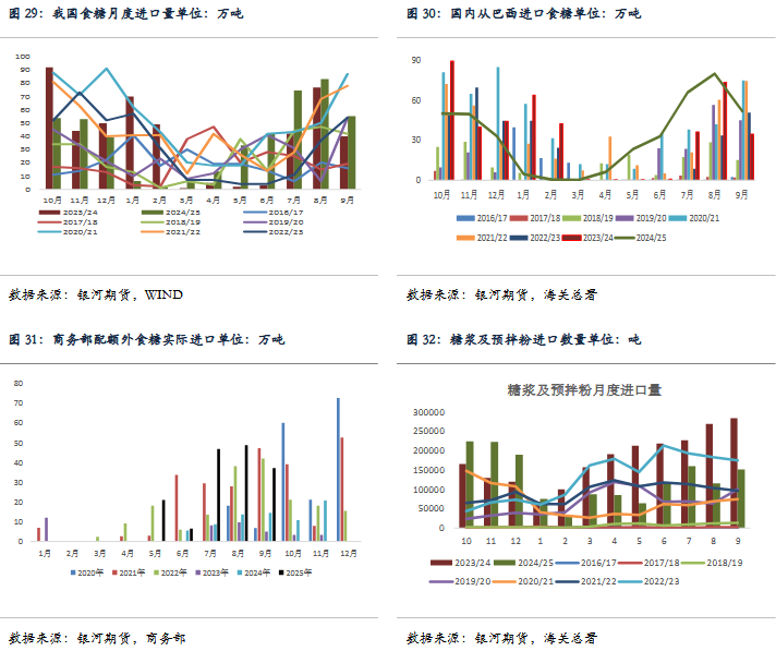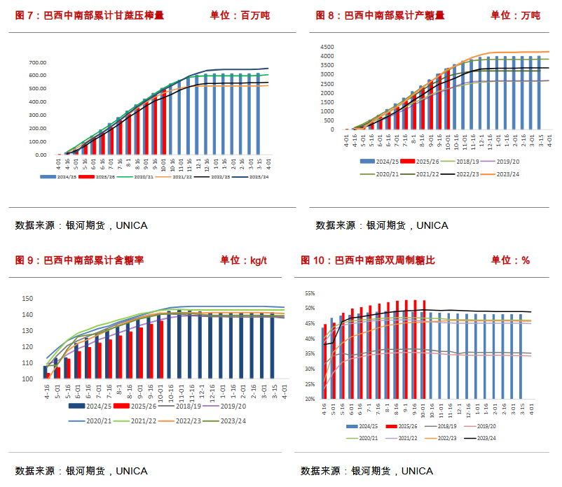 25/26榨季市场普遍对糖产预期较为乐观,近期巴西糖产持续处于高位,巴西新榨季糖产大概率处于历史性高位,北半球糖产降雨较好,预计印度恢复性增产,同比产量大增,泰国和中国新季产量预计也将小幅增加。接下来市场的目光将逐渐聚焦于北半球甜菜和甘蔗收成的表现,这些国家即将迎来压榨期,是未来一段时间对于2025/26年度的产量影响比较大的因素,也是印证增产预期的主要影响因素。