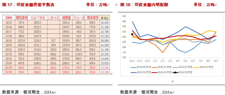24/25榨季印度糖产量预估在2610万吨左右,而需求端,10月的销售配额为240万吨,比去年减少15万吨,处于历年同期的偏中位。截至7月份24/25年度累计净出口量为75.08万吨,和前几年相比出口量非常少。24/25年度,印度批准了100万吨的食糖出口配额。