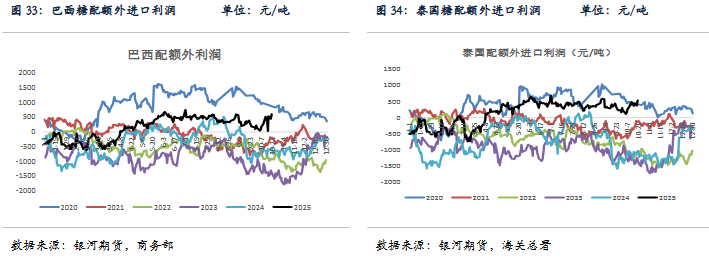 新榨季国内白糖产量预计增加,面积和单产同比都增加,但是含糖率同比下降。内蒙和新疆甜菜糖厂大部分都已经开榨,今年北方降雨增加,甜菜单产大概率增加,内蒙增产幅度可能超过10%,但是糖分可能偏低。而甘蔗糖也陆续将在未来一段时间开榨,从目前的情况来看,今年广西甘蔗由于清桉还蔗等因素影响,本榨季甘蔗种植面积大幅增加,此外由于甘蔗主要生长期广西降雨较多,且9月底和10月初的台风降雨也给甘蔗产量添砖加瓦。但是也由于降雨较多预计糖分比去年有所下降,甚至部分地区糖分要低于往年均值。因此今年白糖的产量大概率是增产且幅度不会太小,但是最终白糖产量增幅可能不及之前市场预期,当然之后的天气和温差对于甘蔗糖分的积累仍有很大的影响,最终产量还需看后期天气。