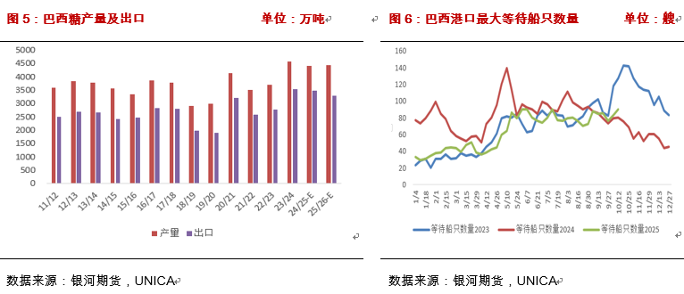 出口方面,8、9月份是巴西糖的出口旺季,但是9月份巴西糖出口量略低于预期。9月份巴西出口糖和糖蜜324.44万吨,环比减少13.34%,同比减少16.35%,处于历年同期中位。2025年1-9月份巴西累计出口糖和糖蜜2348.01万吨,同比减少16.7%,虽然同比减幅较大,但是仅仅比2024年同期低,和之前年份相比累计出口量位于历史高位。巴西对外贸易秘书处(Secex)公布的出口数据显示,巴西10月前三周出口糖233.46万吨,日均出口量为17.96万吨,较上年10月全月的日均出口量16.95万吨增加6%。巴西航运机构wiliams发布的数据显示,截至10月15日当周,巴西港口等待装运食糖的船只数量为90艘此前一周为83艘。港口等待装运的食糖数量为372.72万吨,此前一周为360.81万吨,环比增加11.91万吨,增幅3.3%。其中,高等级原糖(VHP)数量为352.25万吨。桑托斯港等待出口的食糖数量为242.4万吨,帕拉纳瓜港等待出口的食糖数量为72.35万吨。
