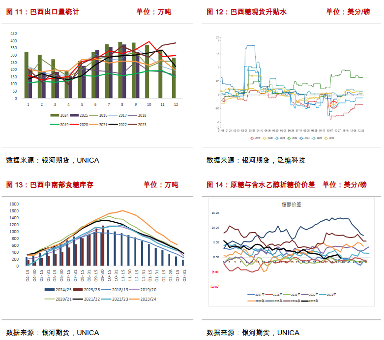 10月份仍是巴西甘蔗压榨高峰期,而11月份巴西糖生产逐渐进入尾声,从目前的双周糖产来看,2025/26榨季巴西的糖产大概率会出现增加,甚至总产量也将大概率处于历年同期的偏高位。预计10月份巴西糖出口量也将处于历年同期的偏高位。