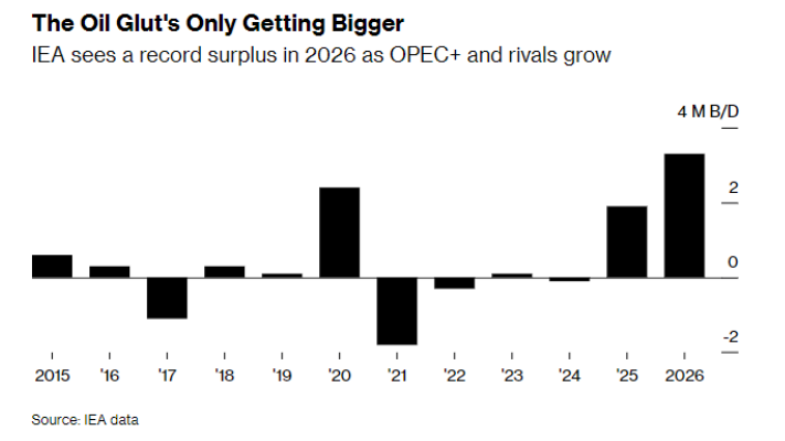 国际能源署(IEA)预测,本季度全球供应过剩量可能突破日均300万桶,明年账面过剩规模或将扩大至空前水平。摩根大通和高盛均预测油价将进一步下跌至每桶60美元以下。