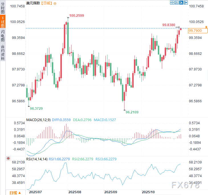 周一美元指数延续前三个交易日涨势,目前上涨约0.10%,前一交易日一度创下99.84的近四个月高点,鲍威尔对12月是否降息的鹰派态度为美元提供坚实支撑。