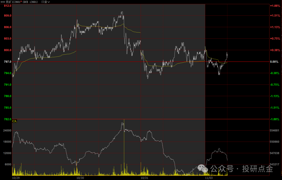 10月31日当周,铁矿石主力合约先涨后跌,主力铁矿石2601合约周增3.83%至800元/吨。周五夜盘窄幅震荡下行,跌幅0.25%,收于798元/吨。