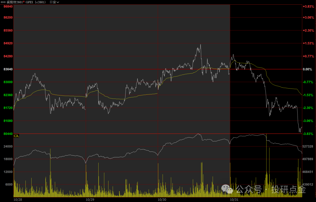 周五LC全天宽幅偏弱震荡,盘中闪崩逾2000点。这一突发走势与前一交易日碳酸锂主力合约的高位震荡形成鲜明对比,目前市场情绪转换快得让人措手不及。01高开低走,开盘报83780,最高冲至84460,最低80260,大跌3.42%收于80780元/吨。2601合约持仓31日减22431至510440手;成交多数缩量,2601合约成交增86128至915245手。