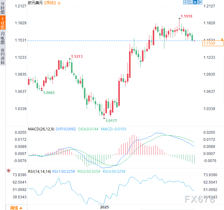 随着欧元/美元周线收于13周以来低点(1.1535),本周或将面临进一步短线下跌。