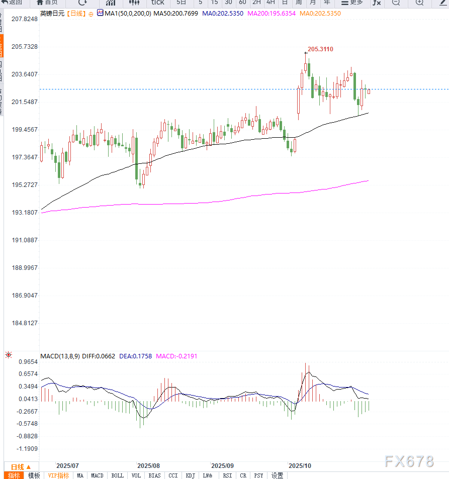 若价格能突破203.50阻力区,将有望测试204.80至205.00的上行目标;反之,若跌破201.80,则可能引发回调并重新测试200关口的中期支撑。总体而言,当前技术面显示汇价处于震荡上升阶段,但短线缺乏突破信号。