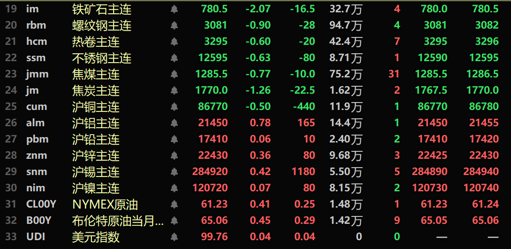 黑色系均飘绿,铁矿跌2.07%,螺纹跌0.9%,热卷跌0.6%,不锈钢跌0.63%。双焦方面:焦煤主力合约跌0.77%,焦炭主力合约跌1.26%。