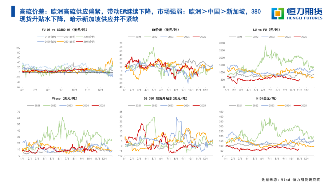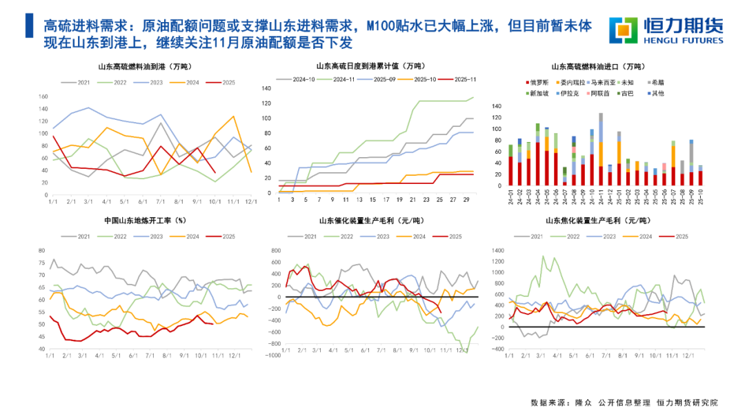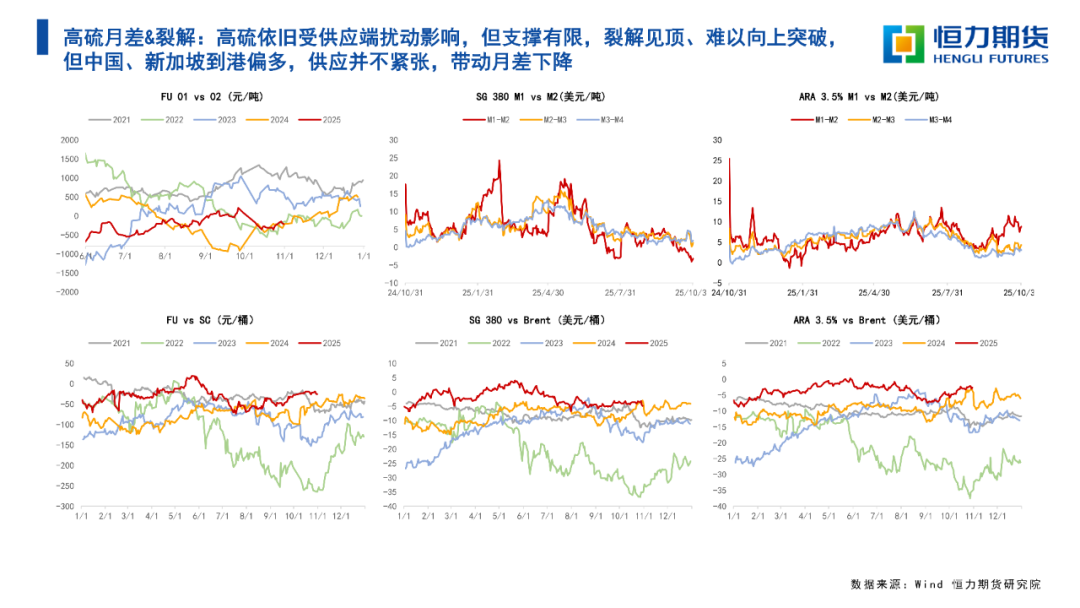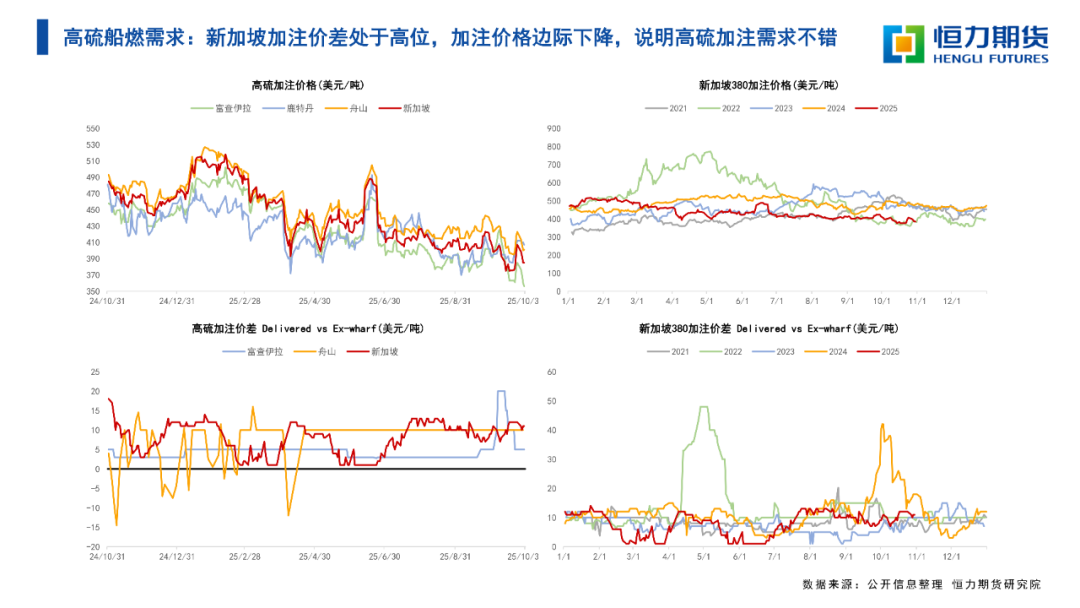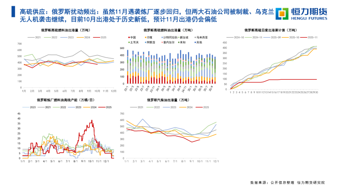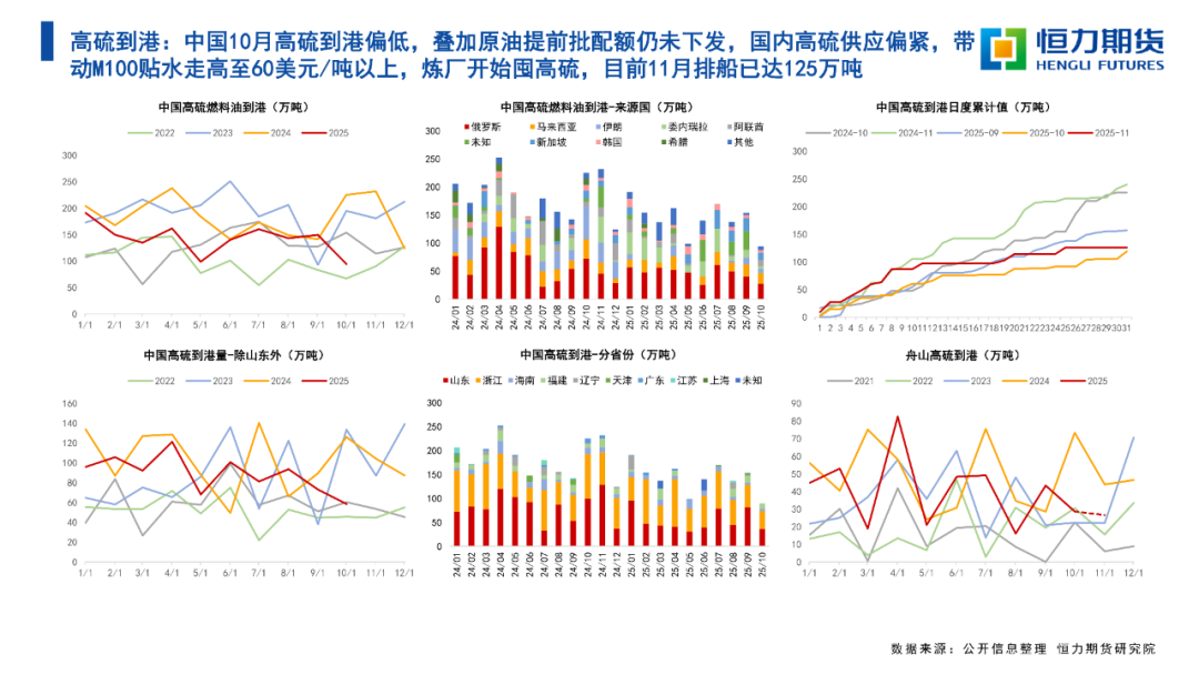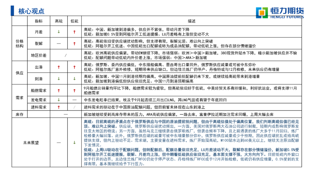 高硫:目前高硫的矛盾点在于俄罗斯供应与中国的原油提前批问题,但由于高硫估值处于偏高位置,我们判断高硫估值已经见顶、难以向上突破。供应端,俄罗斯供应端扰动频出,一方面,美国对俄罗斯两大石油公司进行制裁,短期内或影响俄罗斯发往亚太地区的物流;另一方面,虽然乌克兰继续袭击俄罗斯炼厂,但袭击频率下降,且之前遇袭的炼厂大多于11月回归,炼厂检修量大幅回落。此外,俄罗斯供应端的减量可被中东增量部分弥补,俄罗斯供应减量或少于预期,因此供应端扰乱或给高硫提供支撑,但向上驱动不足。需求端,主要变量在进料需求,炼厂开始囤高硫,M100贴水达到60美元以上,继续关注原油配额下发情况。