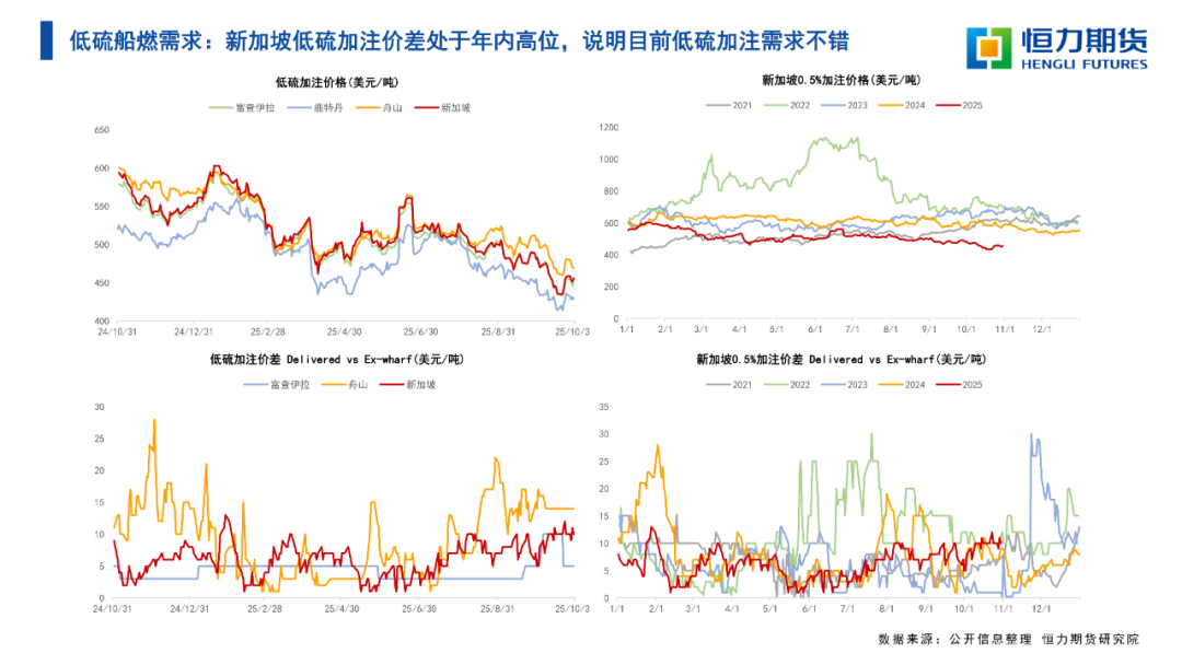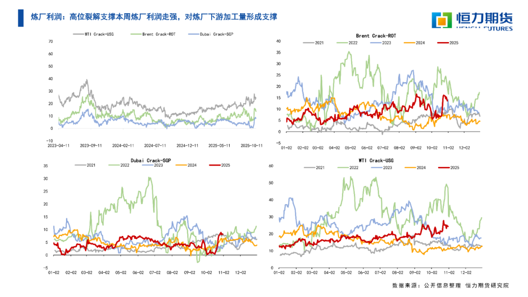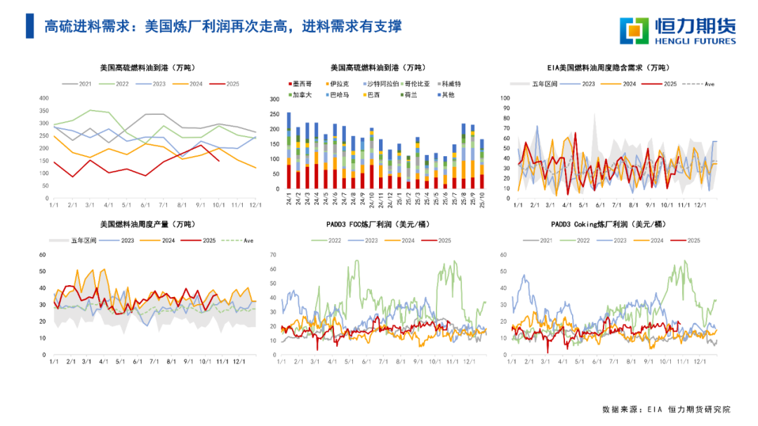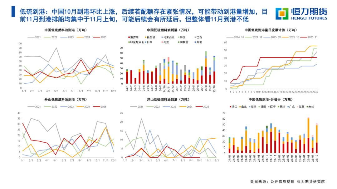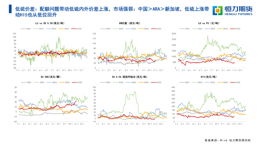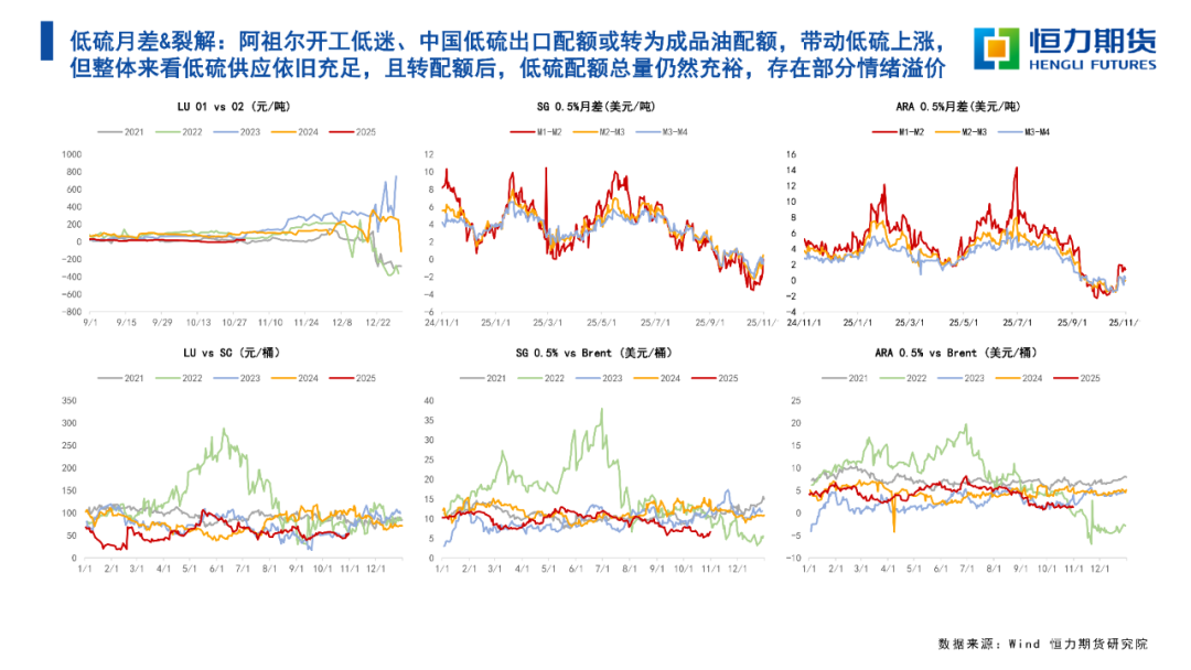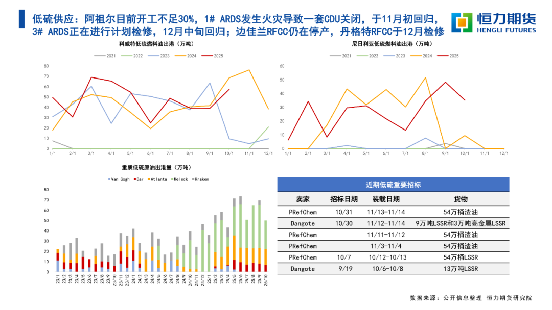 高硫:目前高硫的矛盾点在于俄罗斯供应与中国的原油提前批问题,但由于高硫估值处于偏高位置,我们判断高硫估值已经见顶、难以向上突破。供应端,俄罗斯供应端扰动频出,一方面,美国对俄罗斯两大石油公司进行制裁,短期内或影响俄罗斯发往亚太地区的物流;另一方面,虽然乌克兰继续袭击俄罗斯炼厂,但袭击频率下降,且之前遇袭的炼厂大多于11月回归,炼厂检修量大幅回落。此外,俄罗斯供应端的减量可被中东增量部分弥补,俄罗斯供应减量或少于预期,因此供应端扰乱或给高硫提供支撑,但向上驱动不足。需求端,主要变量在进料需求,炼厂开始囤高硫,M100贴水达到60美元以上,继续关注原油配额下发情况。