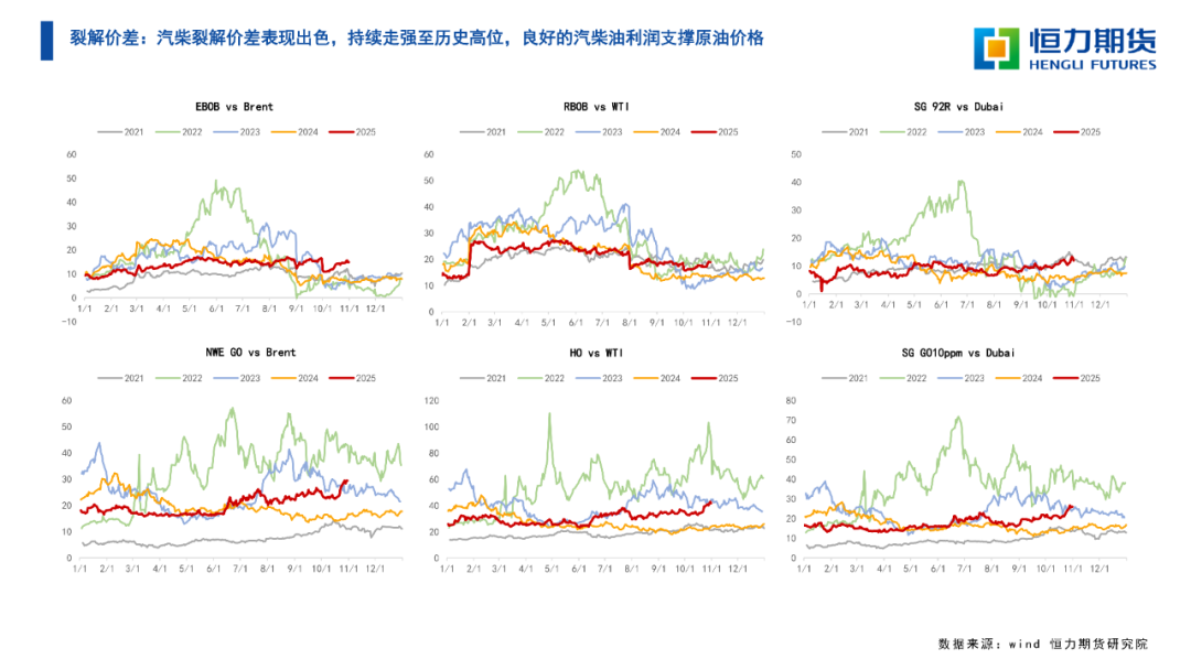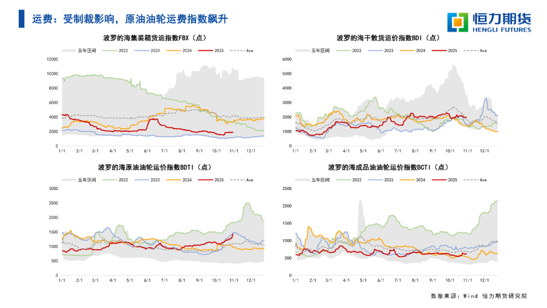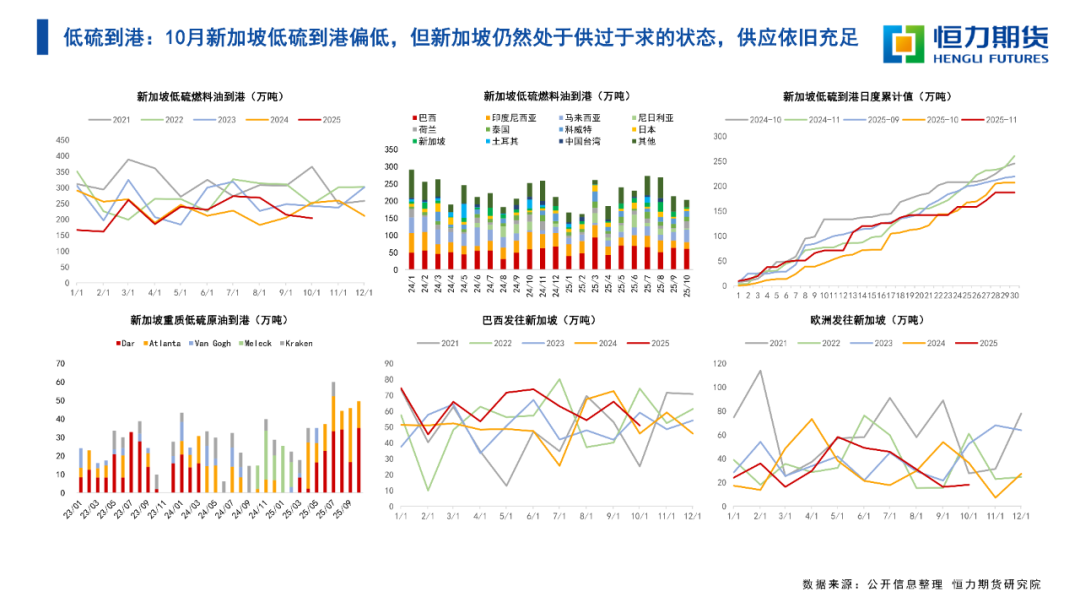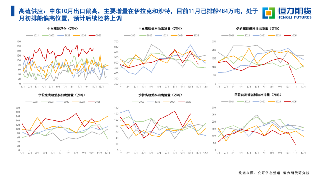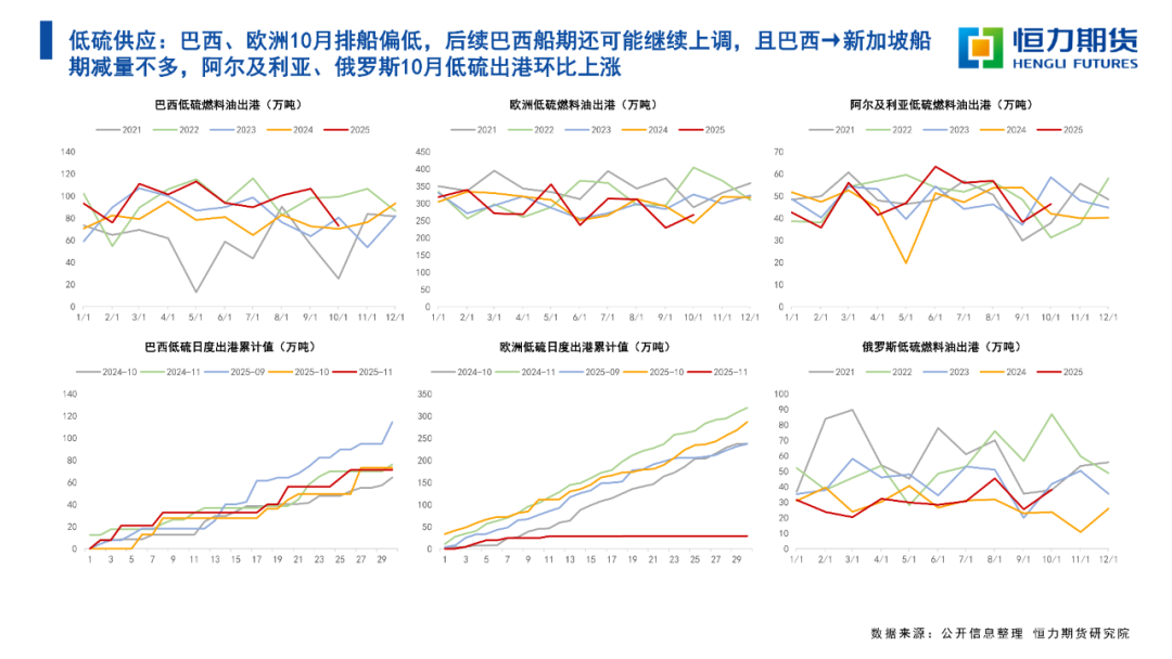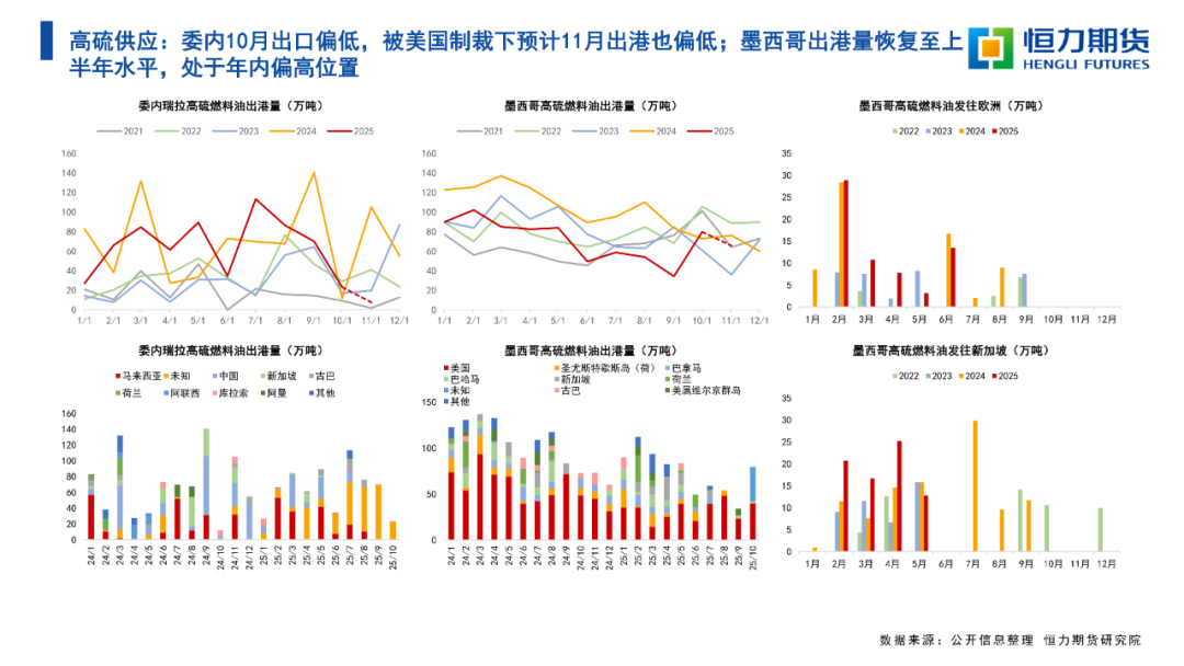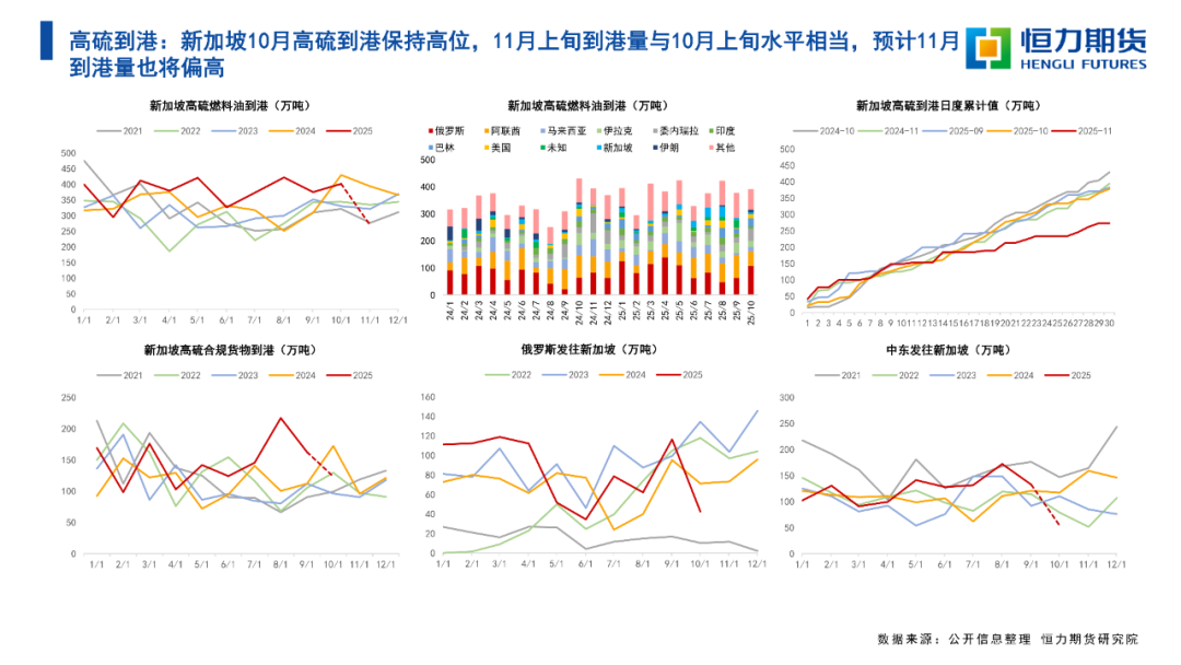 高硫:目前高硫的矛盾点在于俄罗斯供应与中国的原油提前批问题,但由于高硫估值处于偏高位置,我们判断高硫估值已经见顶、难以向上突破。供应端,俄罗斯供应端扰动频出,一方面,美国对俄罗斯两大石油公司进行制裁,短期内或影响俄罗斯发往亚太地区的物流;另一方面,虽然乌克兰继续袭击俄罗斯炼厂,但袭击频率下降,且之前遇袭的炼厂大多于11月回归,炼厂检修量大幅回落。此外,俄罗斯供应端的减量可被中东增量部分弥补,俄罗斯供应减量或少于预期,因此供应端扰乱或给高硫提供支撑,但向上驱动不足。需求端,主要变量在进料需求,炼厂开始囤高硫,M100贴水达到60美元以上,继续关注原油配额下发情况。