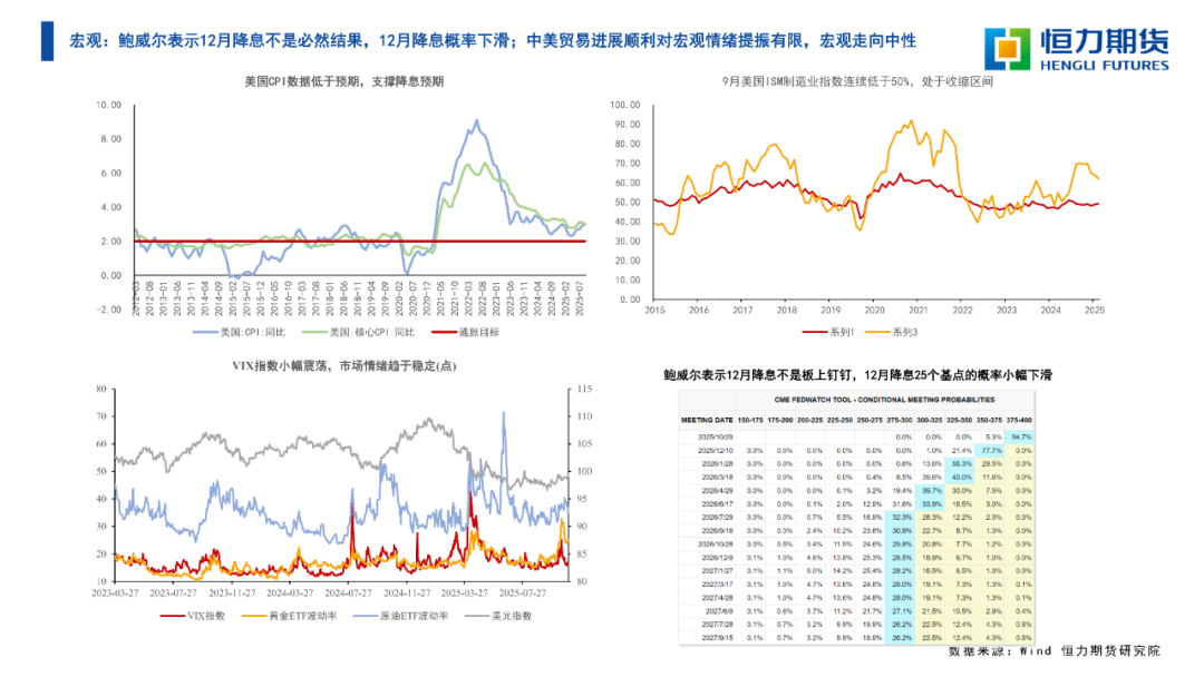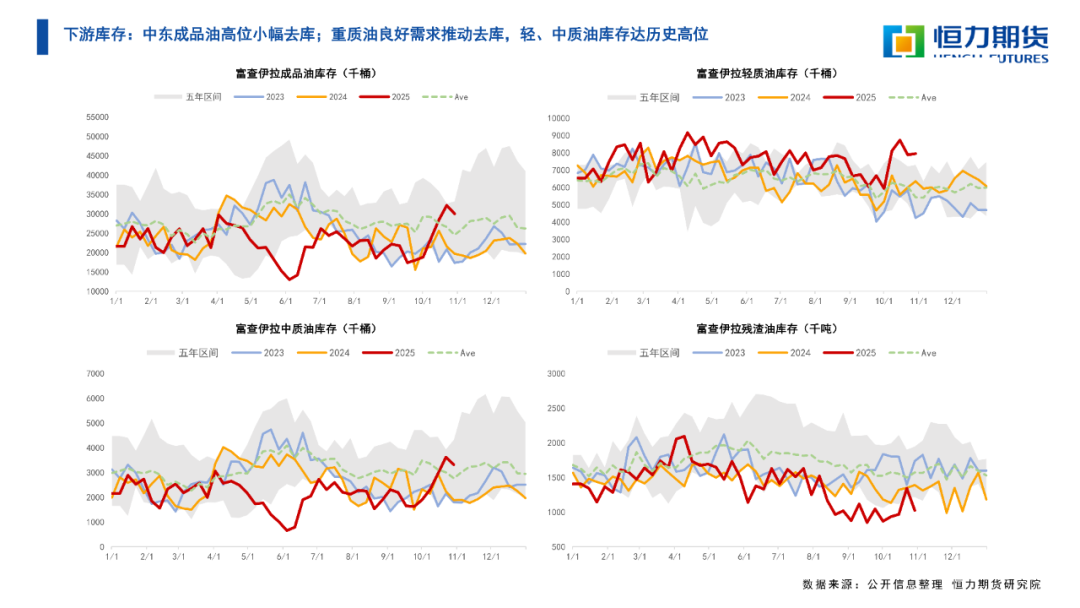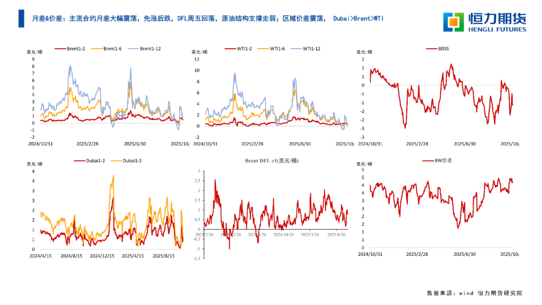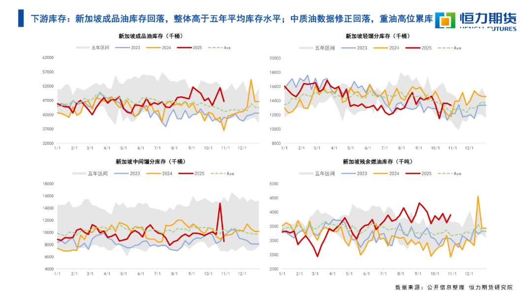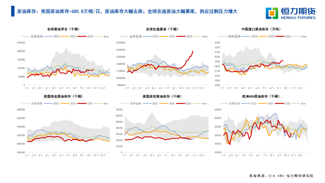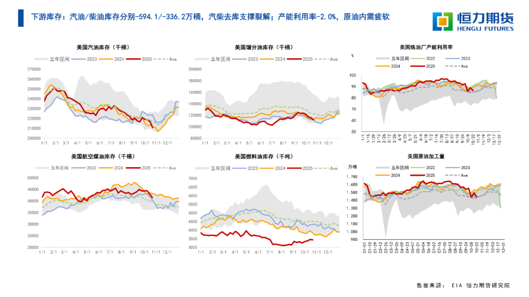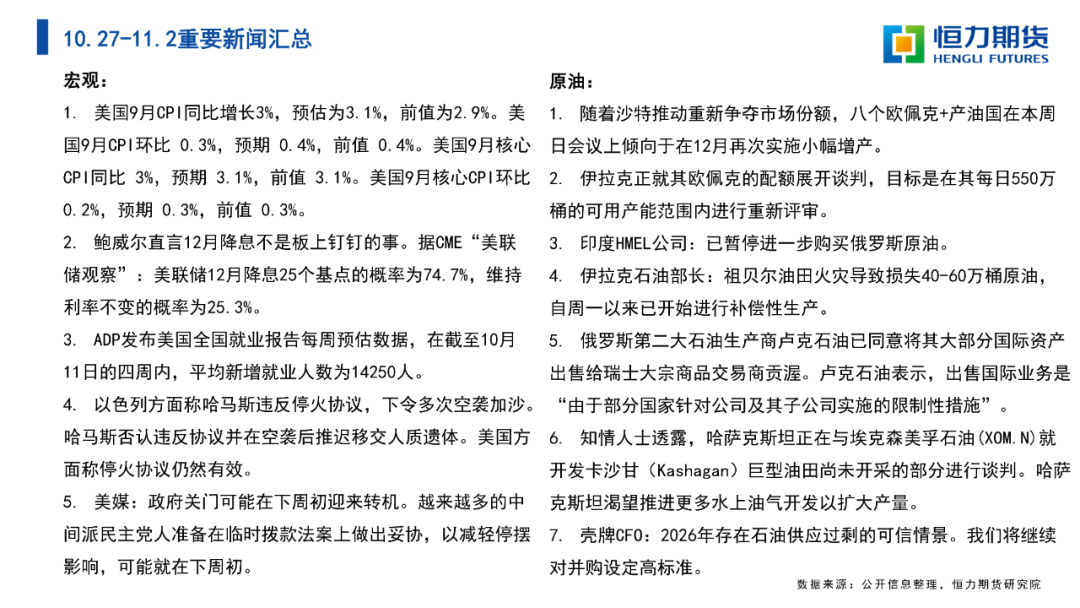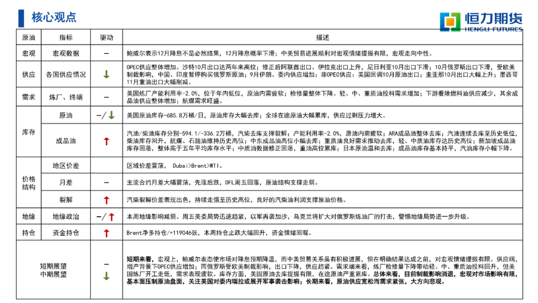 短期来看,宏观上,鲍威尔表态使市场对降息预期降温,而中美贸易关系虽有积极进展,但在明确结果达成之前,对宏观情绪提振有限。供应端,增产背景下OPEC供应增加;而俄罗斯受欧美制裁影响,出口下降,供应趋紧。需求端来看,炼厂检修量下降带动轻、中、重质油投料回升,但美国炼厂开工走低,需求表现疲软。库存方面,美国原油去库提振有限,在途原油严重累库。总体来看,目前制裁影响消退,宏观对市场影响有限,基本面压制原油盘面,关注美国对委内瑞拉或展开军事袭击影响;长期来看,原油供应宽松而需求紧张,大方向悲观。