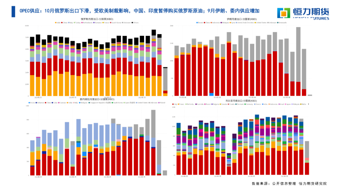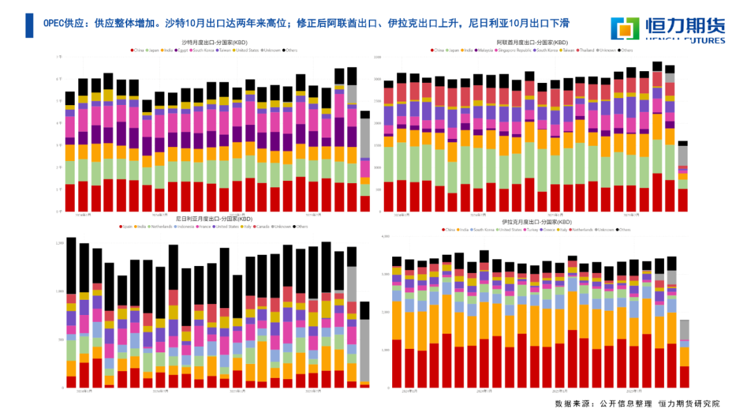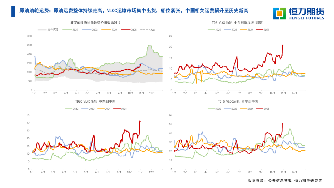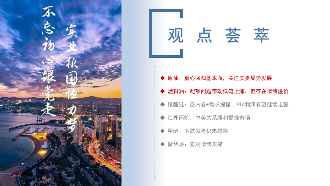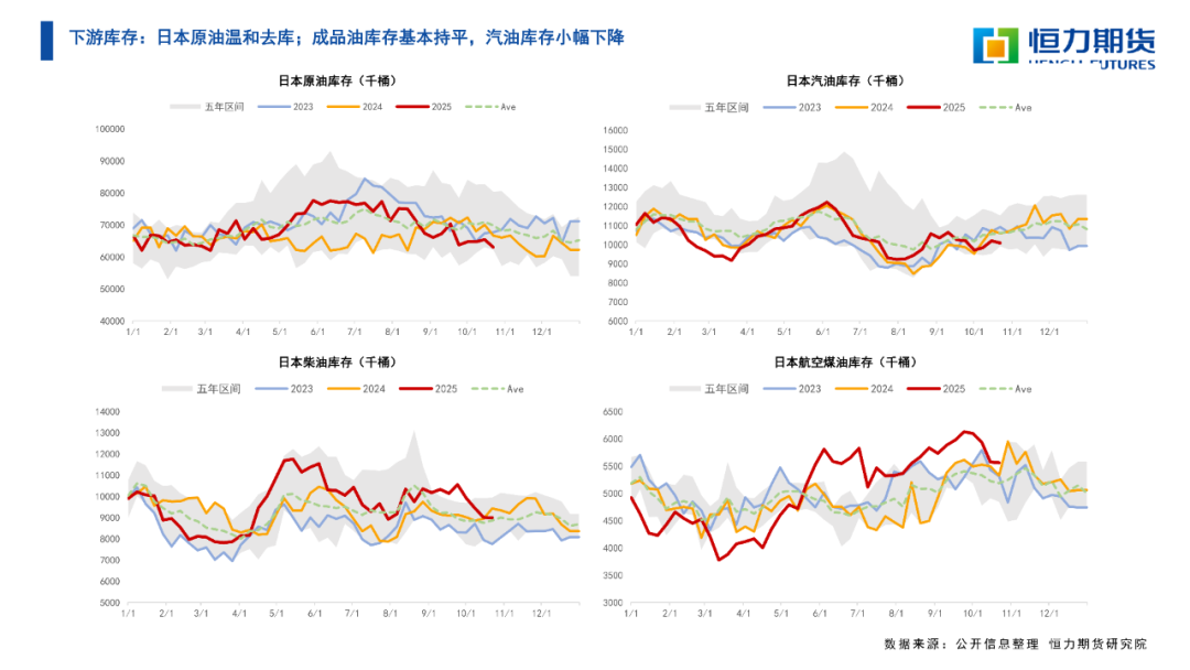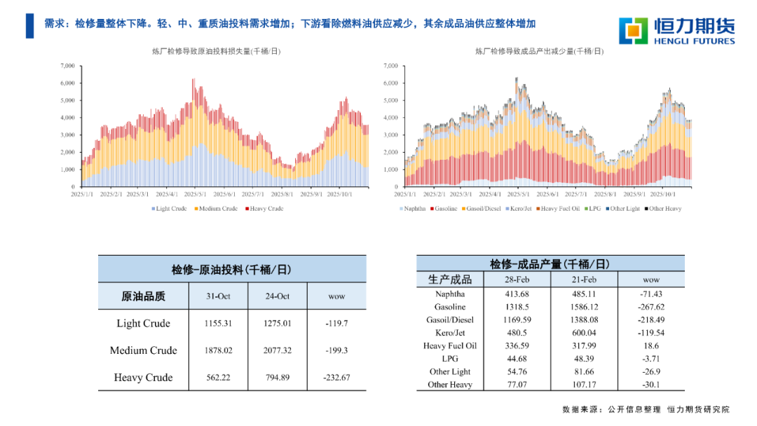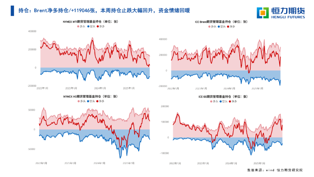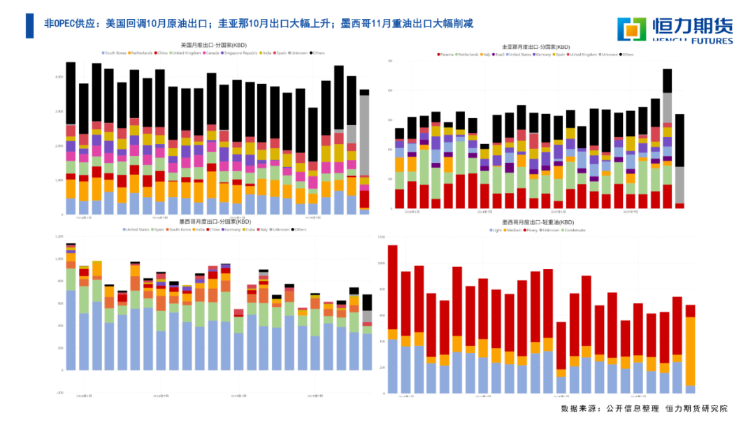 短期来看,宏观上,鲍威尔表态使市场对降息预期降温,而中美贸易关系虽有积极进展,但在明确结果达成之前,对宏观情绪提振有限。供应端,增产背景下OPEC供应增加;而俄罗斯受欧美制裁影响,出口下降,供应趋紧。需求端来看,炼厂检修量下降带动轻、中、重质油投料回升,但美国炼厂开工走低,需求表现疲软。库存方面,美国原油去库提振有限,在途原油严重累库。总体来看,目前制裁影响消退,宏观对市场影响有限,基本面压制原油盘面,关注美国对委内瑞拉或展开军事袭击影响;长期来看,原油供应宽松而需求紧张,大方向悲观。