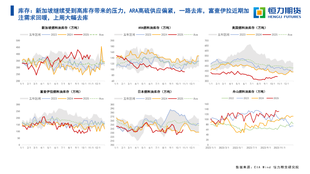 低硫:上周LU驱动在于配额问题,但转配额后,配额总量依旧充足,LU月差波动不大,裂解存在部分情绪溢价,新加坡0.5%受到阿祖尔开工低迷提振,裂解、月差均上涨,但中期看低硫供应依旧充足,基本面支撑不强,大方向向下。目前低硫内外窗口处于打开的边界,且边佳兰炼厂RFCC仍处于停产状态、丹格特炼厂RFCC或于12月开始检修,低硫仍有供应增量,0.5%受到的支撑有限,基本面继续给予下行压力。