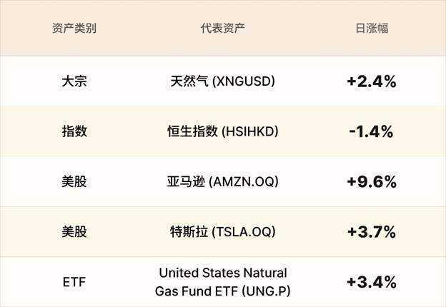 截至10月31日收盘,在EBC产品中,天然气和百时美施贵宝股价领涨,亚马逊股价领涨。该公司公布的第三季度财报超出预期,其云计算业务板块也实现了强劲增长。