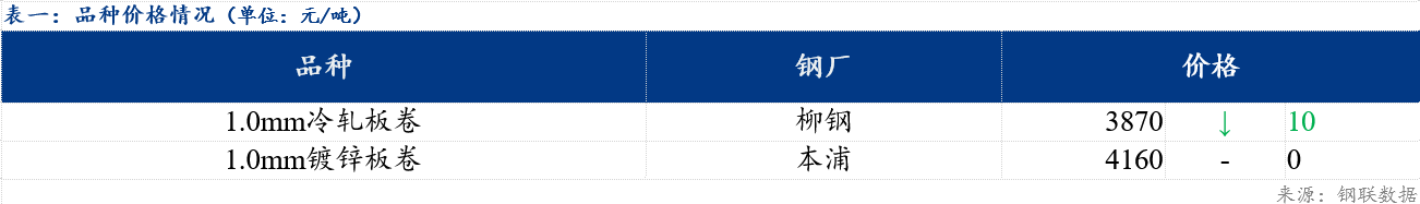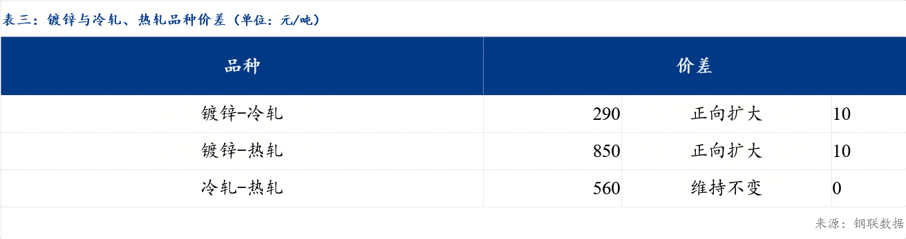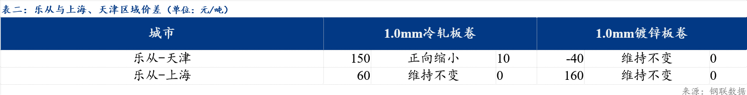 今日冷轧板卷乐从与天津价差较上一交易日收窄10元/吨,乐从与上海价差较上一交易日持平;镀锌板卷乐从与天津价差较上一交易日持平,与上海价差较上一交易日持平。品种价差方面,镀冷价差较上一交易日扩大10元/吨,镀热价差较上一交易日扩大10元/吨,冷热价差较上一交易日持平。