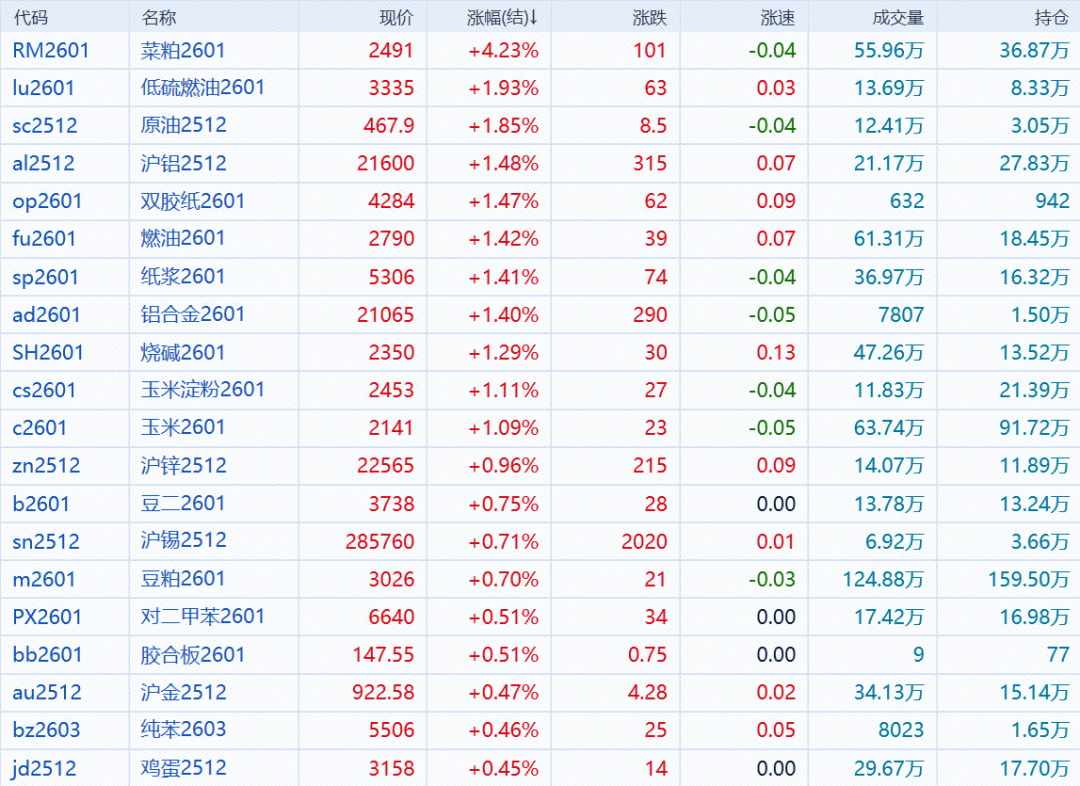 11月3日,午市收盘,国内期货主力合约涨跌不一,菜粕涨超4%,SC原油、LU燃油、铝合金、纸浆、沪铝、双胶纸、燃料油、烧碱、淀粉、玉米涨超1%。跌幅方面,BR橡胶跌超3%,甲醇、纯碱跌超2%,铁矿石、集运欧线、棕榈油跌近2%。