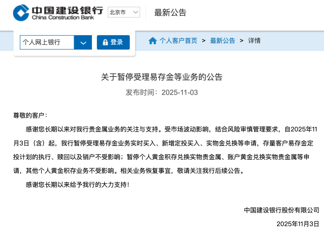 同日,中国建设银行也发布公告称,受市场波动影响,结合风险审慎管理要求,自2025年11月3日(含)起,该行暂停受理易存金业务实时买入、新增定投买入、实物金兑换等申请,存量客户易存金定投计划的执行、赎回以及销户不受影响;暂停个人黄金积存兑换实物贵金属、账户黄金兑换实物贵金属等申请,其他个人黄金积存业务不受影响。