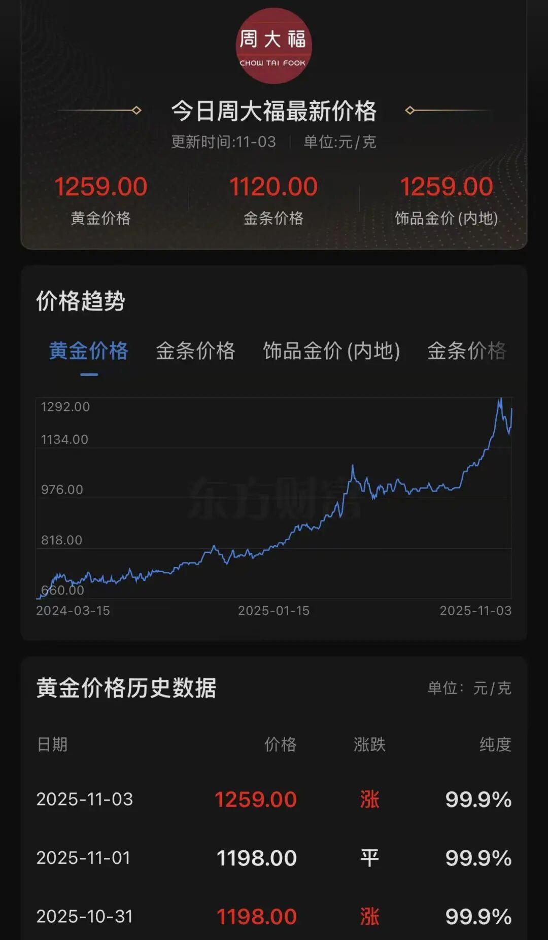 11月3日,多家黄金珠宝商涨价。周大福足金首饰为1259元/克,较前一日涨价61元/克。