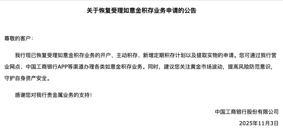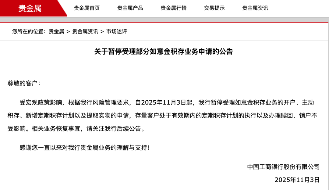 工行称,受到宏观政策影响,根据工商银行风险管理要求,自2025年11月3日起,工商银行暂停受理如意金积存业务的开户、主动积存、新增定期积存计划以及提取实物的申请。存量客户处于有效期内的定期积存计划的执行以及办理赎回、销户不受影响。相关业务恢复事宜,请关注工商银行后续公告。