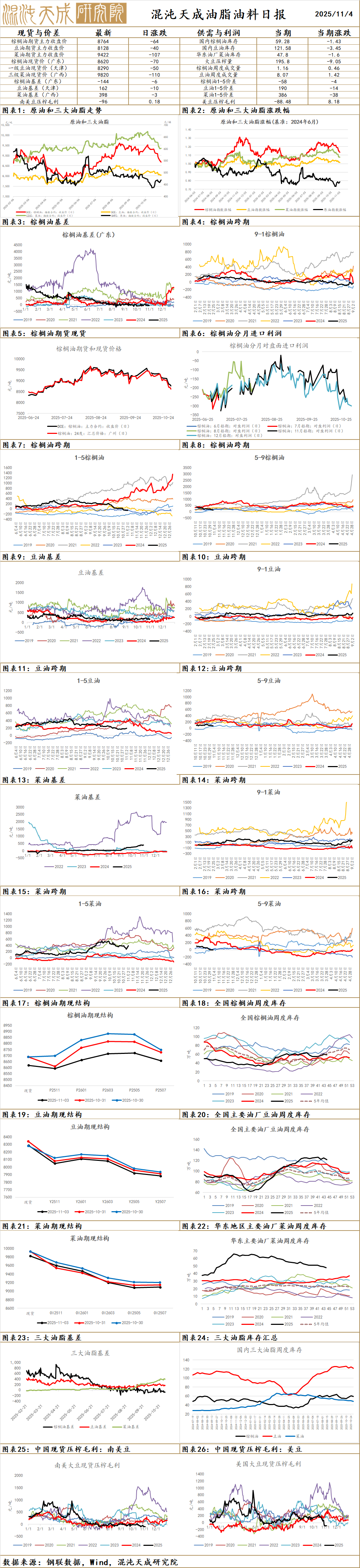 昨日棕榈油主力收盘8664元/吨,下跌136元/吨,跌幅1.55%;基差:天津106(30),山东46(30),江苏-44(30),广东-114(30)。