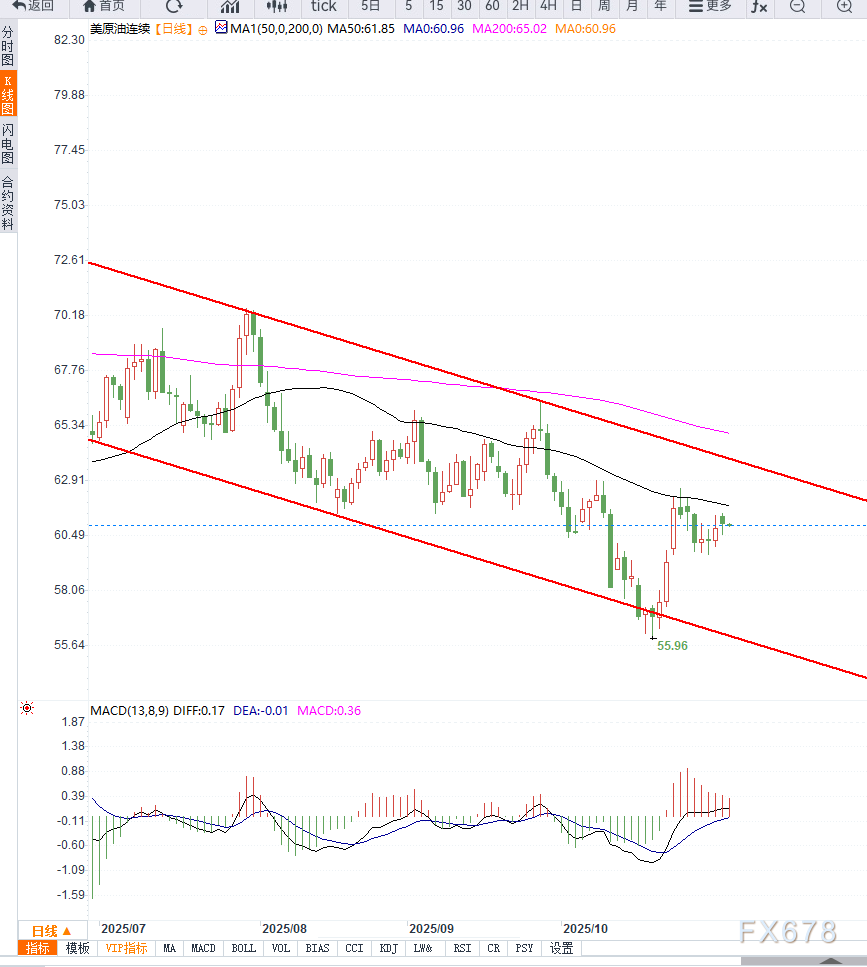 从技术面来看,美原油(WTI)日线图显示价格近期在59至63美元区间内震荡整理,形成明显的箱体结构。价格目前运行在9日指数移动均线(EMA)上方,短期动能略显积极,但14日相对强弱指数(RSI)仍徘徊在50附近,显示多空力量处于平衡状态。