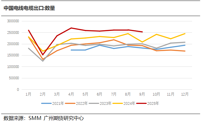 与铜直接相关的就是电线电缆出口保持高速增长,据海关总署数据显示,2025年9月我国电线电缆出口总量为25.23万吨,同比增长21.38%。其中铜线缆9月出口12.48万吨,同比增长45.38%。