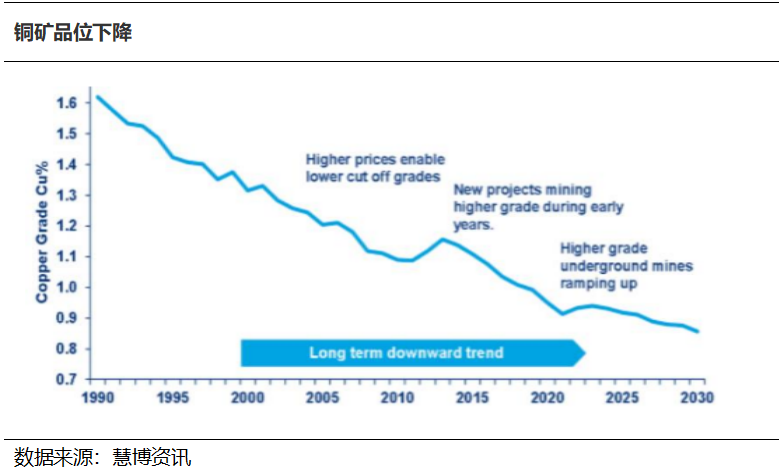 品位下降:全球铜矿石的平均品位已从数十年前的1%至2%,下降到目前的不足0.7%,易于开采的高品位铜矿资源日趋枯竭。新发现的矿床往往位于更深、更偏远或地质条件更复杂的地区,导致开采成本显著上升,进一步抑制了投资热情。