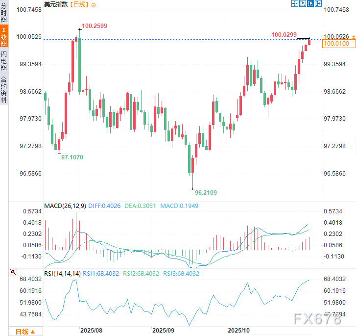 汇通财经APP讯——美元指数周二(11月4日)连续第五个交易日走强,涨幅约0.15%,一度达到100.03的近三个月高点,若此处动能转弱,可能标志ABC平势调整的C浪开启。但目前该关口仍是多空双方激战争夺的关键点位。澳元兑美元延续前四个交易日跌势,跌幅约0.08%。