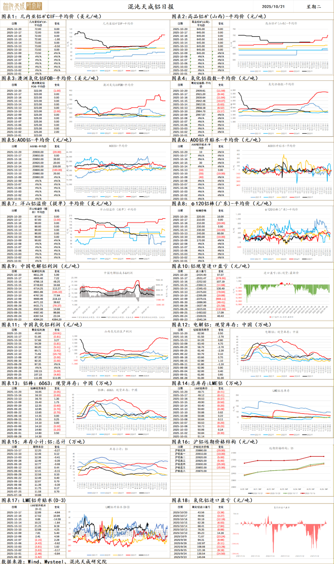 2.【9月份中国铝冶炼产业景气指数小幅上升仍处于“正常”区间】SHMET10月21讯,中国铝冶炼产业月度景气指数监测模型结果显示,9月份,中国铝冶炼产业景气指数为52.4,较8月份上升3.7个点,处于“正常”区间;先行指数为71.7,较8月份上升4.8个点。(中国有色金属报)