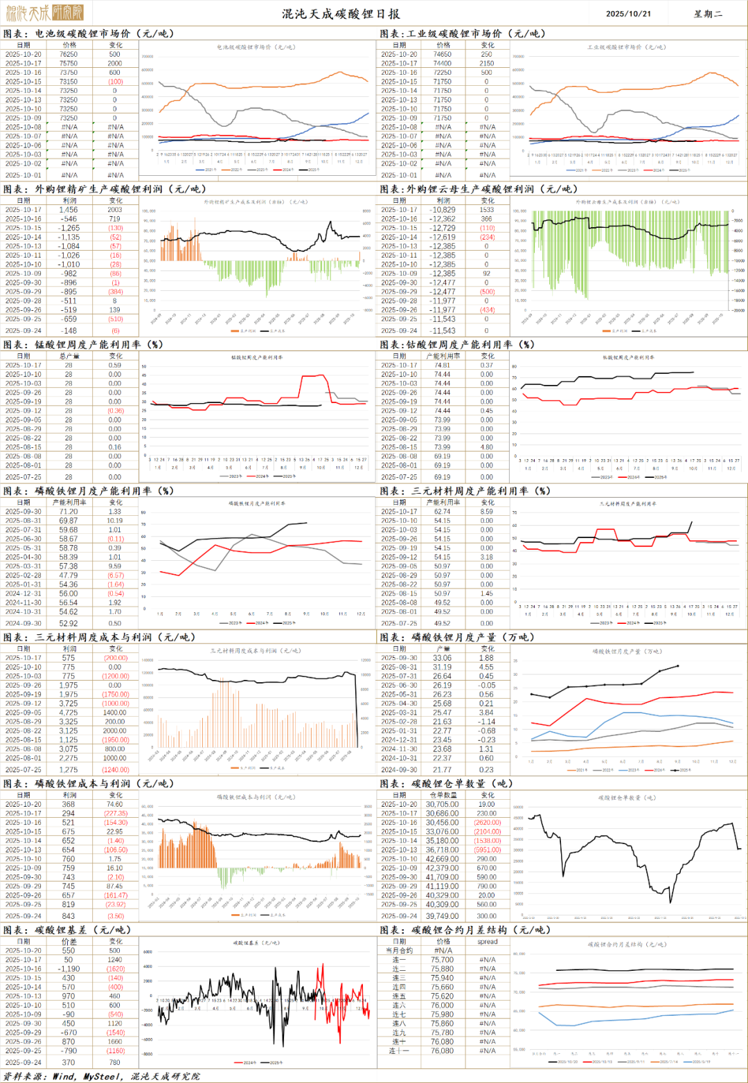 昨日碳酸锂主力合约收盘价75980元/吨,涨跌幅-0.26%。主力合约持仓310199手,仓单-813至29892吨。现货方面,电池级碳酸锂报价维持76250元/吨,工业级碳酸锂报价维持74650元/吨。锂精矿均价+5至865美元/吨。