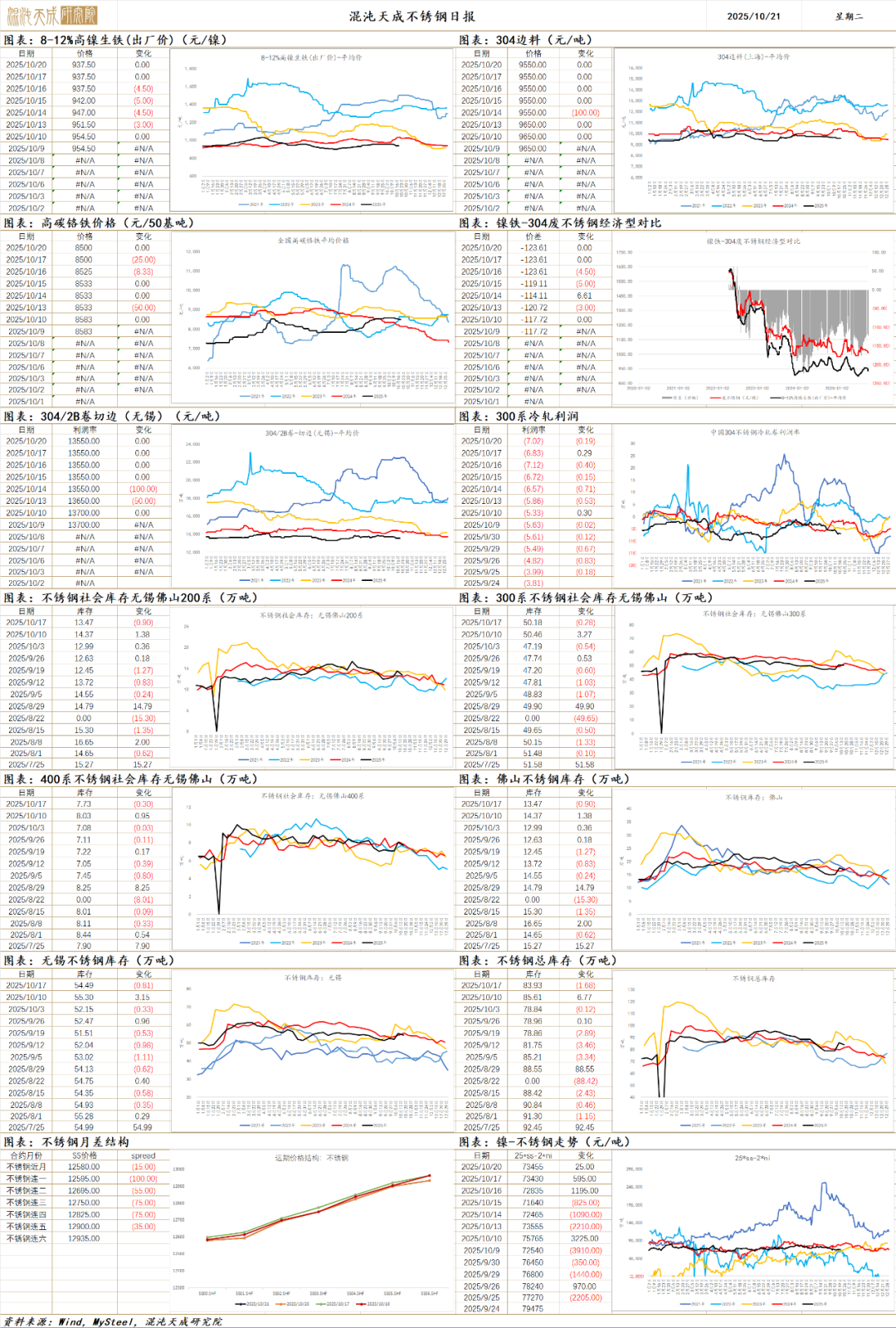 原料端,昨日印尼高镍生铁到港价-1至941元/镍点,当前镍铁现货供应充足,价格低位震荡。