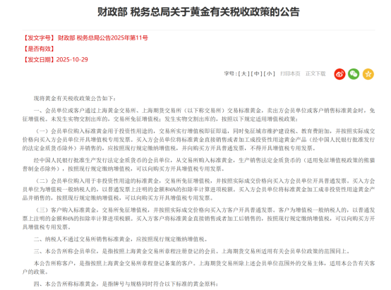 这与11月1日财政部、税务总局颁布的《关于黄金有关税收政策的公告》的正式施行,有着密切关联。不过,专家在接受大河财立方记者采访时表示,此次新政对普通人购金的影响较小,主要是针对产业链上游而制定。