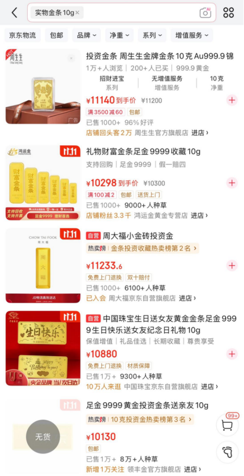 这一点,也在电商平台的售价变动中得到了体现。11月1日新政实施后,大量实物黄金纷纷涨价。以10克重的投资金条为例,几乎所有商家的售卖价格都在1万元以上,单价均超过1000元/克,相比于多家银行925元-935元/克的单价高出7%以上。
