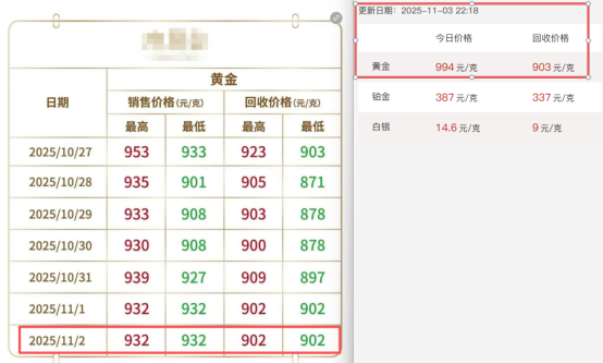 某水贝商家贴出的黄金价格,11月3日相比11月2日大幅上涨