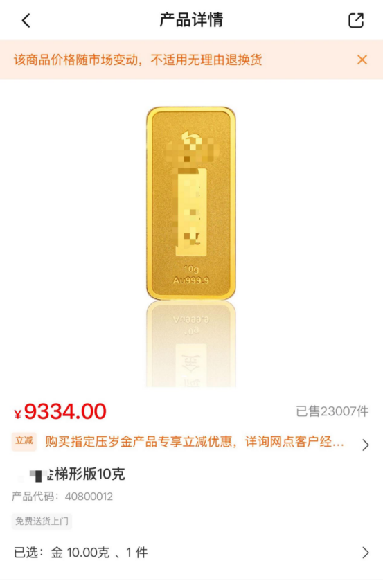 某股份制银行售卖的实物黄金,10克价格低于电商平台