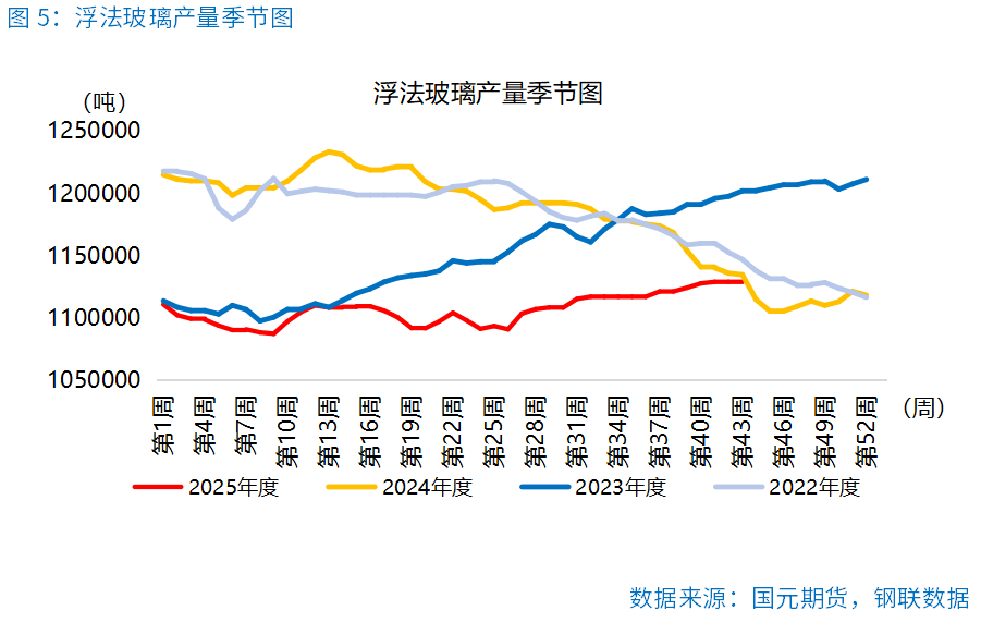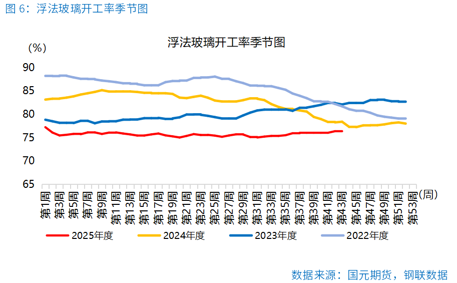 供应端来看,浮法玻璃供应短期维持稳定,中长期仍有变动。沙河煤制气项目切改对国内玻璃总日熔影响有限,但考虑到各浮法玻璃厂家产线切改进度具备一定弹性,线新旧更替期间可能出现时空错配情况。根据隆众资讯统计,沙河地区燃煤产线中仍有约合计0.37万吨/天的产线暂不明确燃料切换具体计划。浮法玻璃周供应维持稳定,截至2025年10月23日,浮法玻璃行业日熔量16.13万吨/天,开工率为76.35%。
