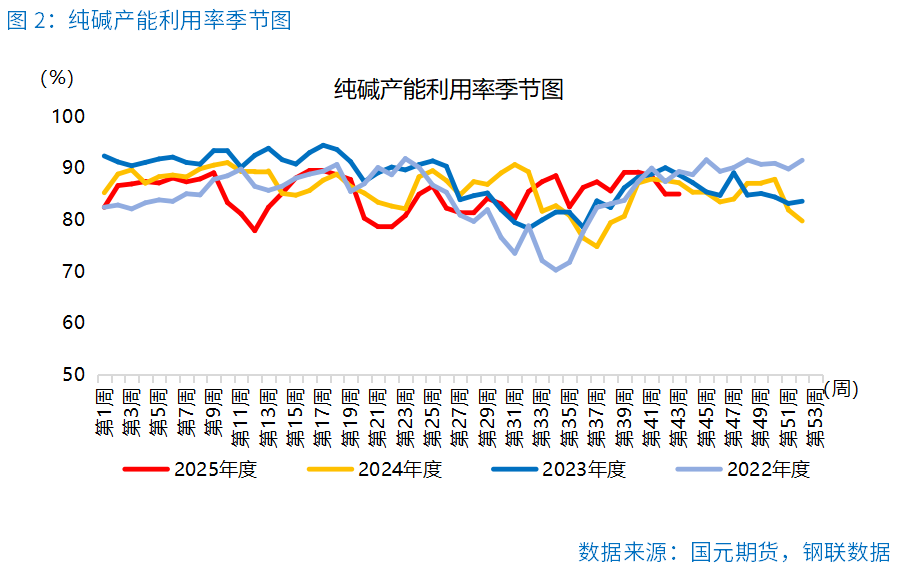 近期随着个别装置开车,纯碱供应略有上行,短期内仍有装置面临恢复,暂无装置检修,纯碱供应或有窄幅上行。根据隆众资讯统计,湖北双环提负荷,河南中天设备开车,点火的安徽德邦尚未出产品,天津碱厂开车时间未定,预计可能在10月底附近恢复。截至10月23日,纯碱综合产能利用率84.94%,环比增加0.01个百分点。
