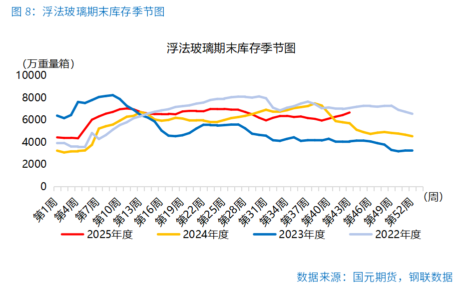 需求来看,浮法玻璃“金九银十”旺季表现同比偏弱,下游深加工企业需求疲软,旺季不旺特征有所显现。下游深加工企业订单较双节假期前环比有所下滑,同比去年则大幅下降超20%。截至2025年10月15日,全国深加工样本企业订单天数均值10.4天,环比下跌5.5%,同比下跌21.2%,为2019年以来同期最低水平。