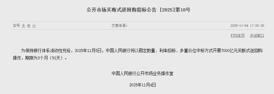 11月4日,央行公告,为保持银行体系流动性充裕,2025年11月5日,中国人民银行将以固定数量、利率招标、多重价位中标方式开展7000亿元买断式逆回购操作,期限为3个月(91天)。