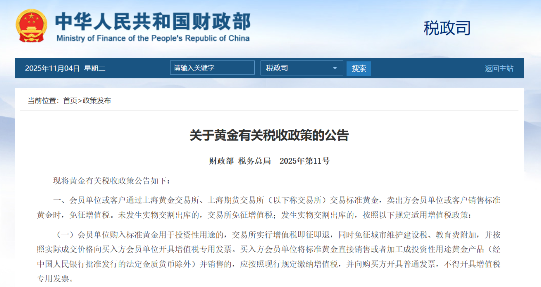 11月1日,财政部、税务总局2025年第11号公告与国家税务总局23号征管公告正式落地,取代了沿用20余年的黄金税收政策体系。