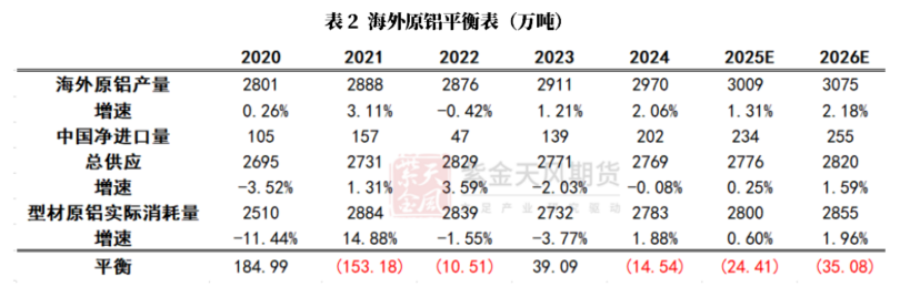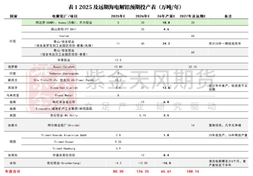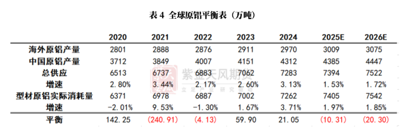 明年来看,海外预期投产骤减,俄铝对华输入预计进一步扩大,海外供应更加不容乐观。2026年海外原计划投产规模约250万吨,但从最新排产进度来看,我们已下调预期新增产能至126.25万吨,其中30%产能在下半年才能释放。因此我们预计2026年海外电解铝产量净增仅有65.61万吨,增速2.18%。考虑对中国的净出口后,即便投产顺利,2026年海外原铝总供给量仅为2819.9万吨,同比1.59%,平衡表缺口进一步扩大。
