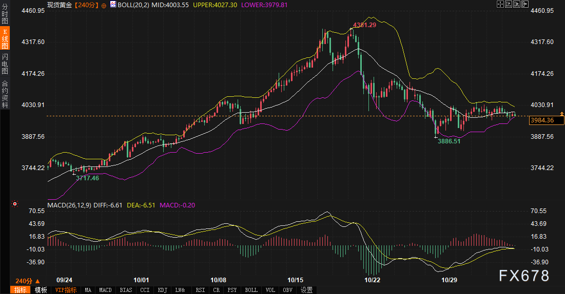 技术面阻力:现货黄金240分钟图MACD指标(DIFF-6.15,DEA-6.42)仍在零轴下方运行,且仍处于死叉状态,空头动能占据主导。盘面已跌破布林带中轨4003.81,短期面临技术性压力。此前,市场对美联储降息的预期已部分兑现,削弱了黄金的投机性需求。