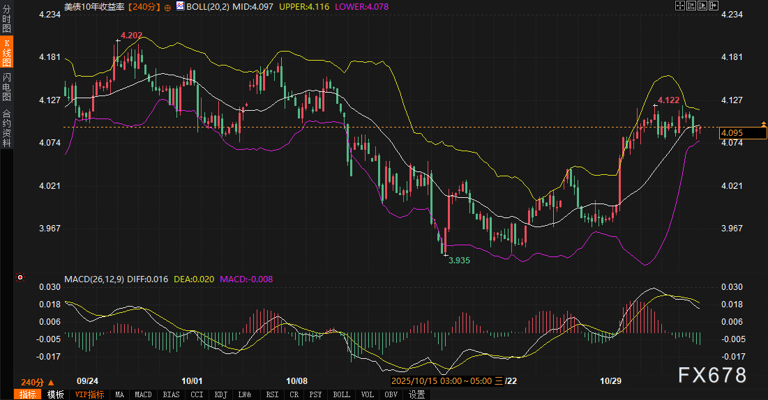 技术面:10年期美债收益率在近期成功守住了4.12%的关键阻力位,未形成有效突破。未来2-3日的交易偏向于在近期区间内双向波动,4.07%至4.11%是短期需要关注的核心区间。240分钟图上,其MACD(DIFF 0.016,DEA 0.020)已出现死叉迹象,布林带中轨4.097%是日内多空争夺的焦点。